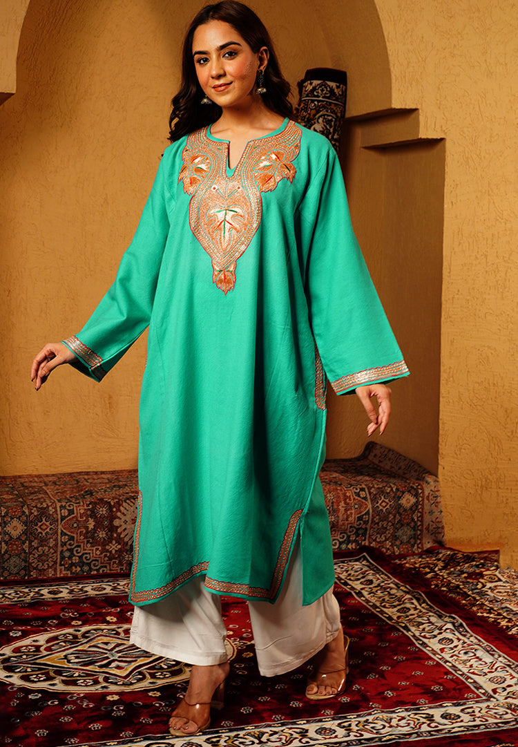 Celadon Green Tilla Embroidered Kashmiri Silk Pheran Set