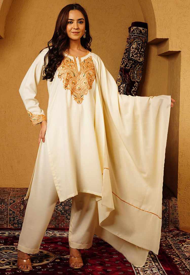 White V Neck Design Tilla Embroidered Kashmiri Silk Pheran Set
