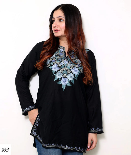Black Arm Design Aari Embroidered Kashmiri Cotton Kurti