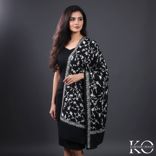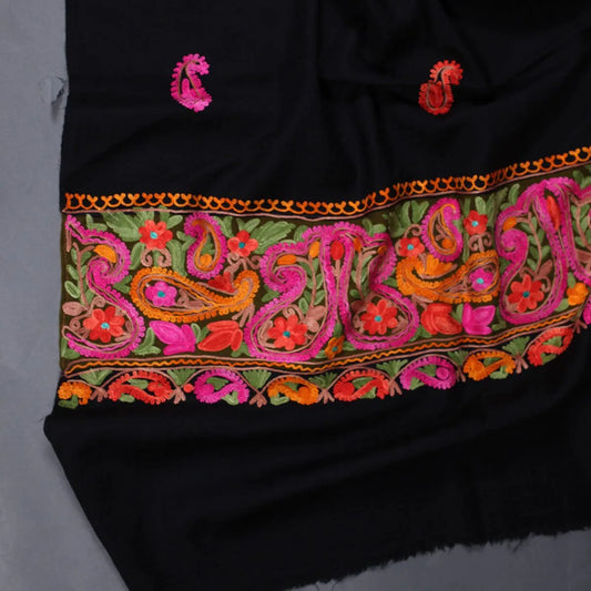 Black Base Floral Design Aari Embroidered Pure Kashmiri Woolen Stole