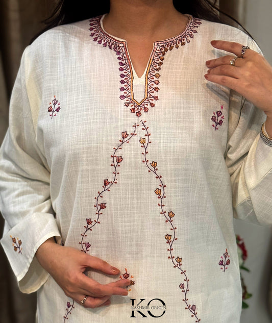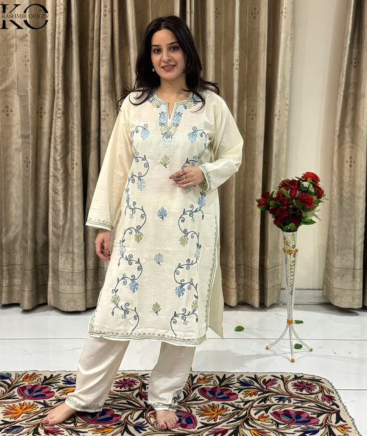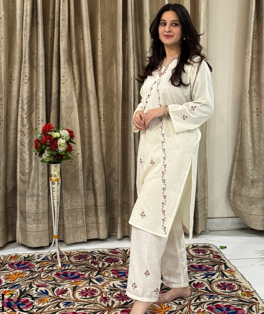 Hand Sozni Embroidered Bootidaar White Kashmiri Co Ord Set