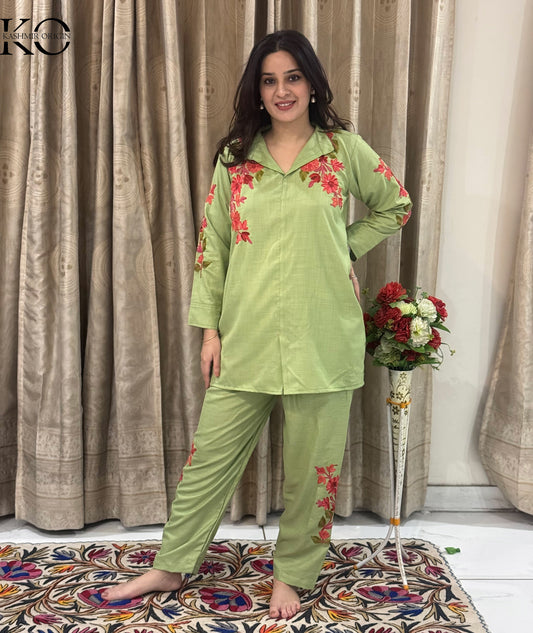 Green Base Aari Embroidered Cotton Co ord Set