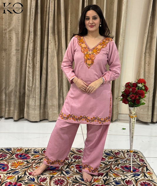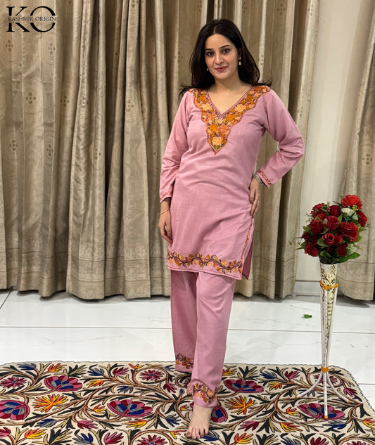 Peach Aari Embroidered Modern Design Kashmiri Co Ord Set