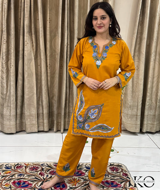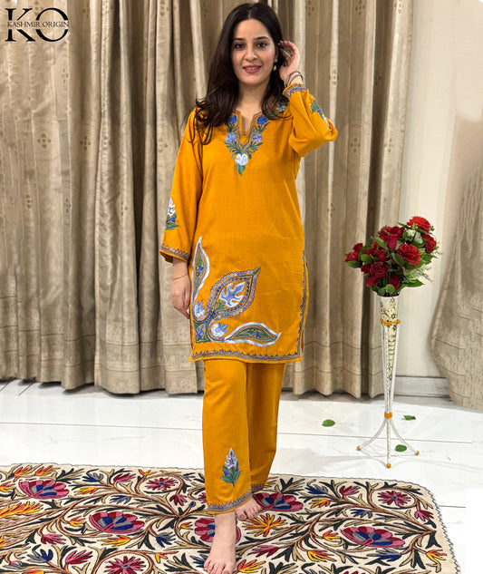 Sun Yellow Round Neck Design Aari & Zari Embroidered Kashmiri Co Ord Set