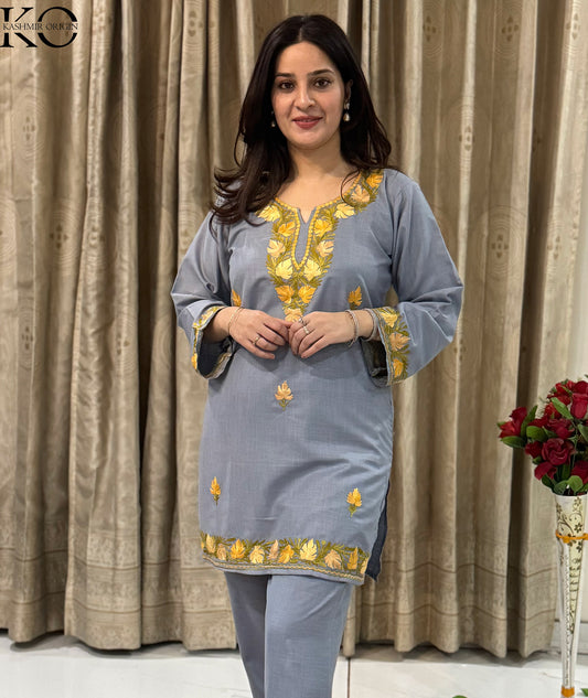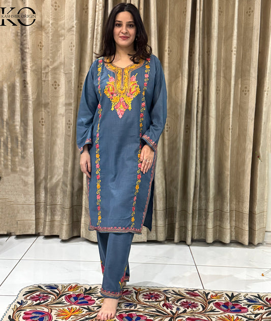 Shop our exquisite Kashmiri Aari Embroidered Co-ord Set. This full suit features intricate hand embroidery, showcasing the rich craftsmanship of Kashmiri artisans.