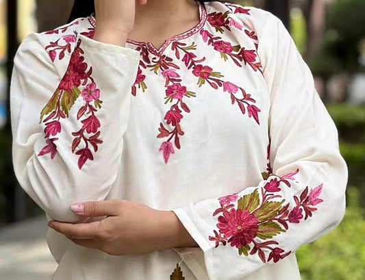 Creme Base Multi Colour Floral Design Aari Embriodered Cord Set | Full Suit
