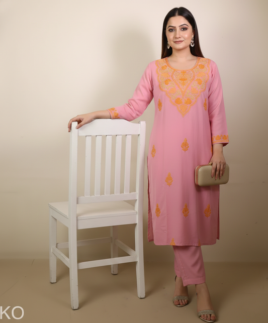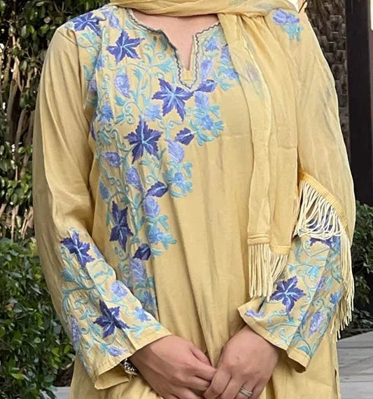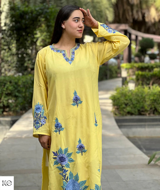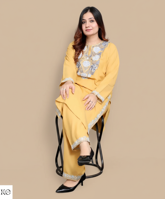 Sun Yellow Round Neck Design Aari & Zari Embroidered Kashmiri Co Ord Set
