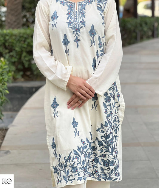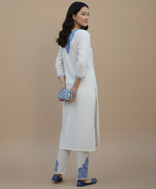 White & Blue Aari Embroidered Cotton Co ord Set Front Back Work
