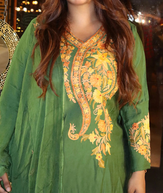 Hand Sozni Embroidered Jungle Green Front Jaali Design Kashmiri Co Ord Set