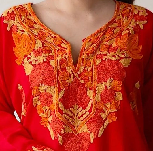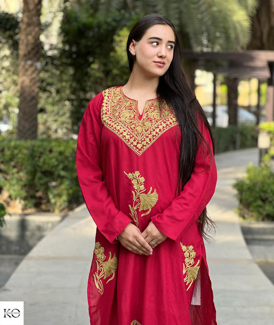 Peach With Red Aari Embroidered Kashmiri Co Ord Set