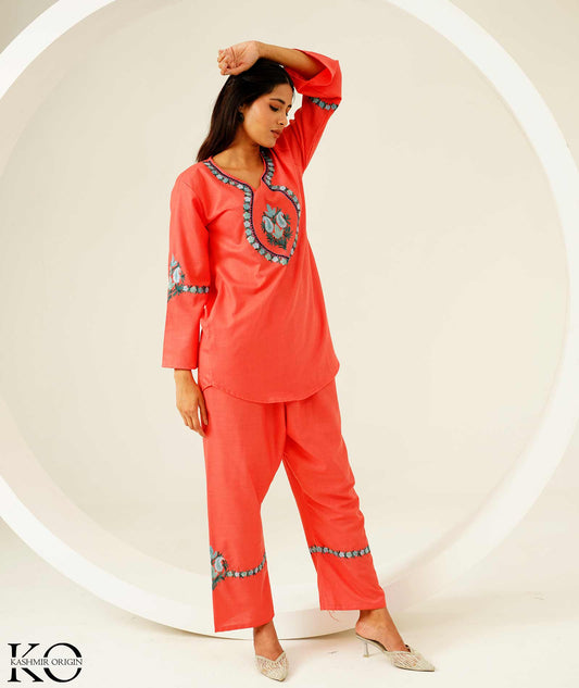 Peach With Red Aari Embroidered Kashmiri Co Ord Set
