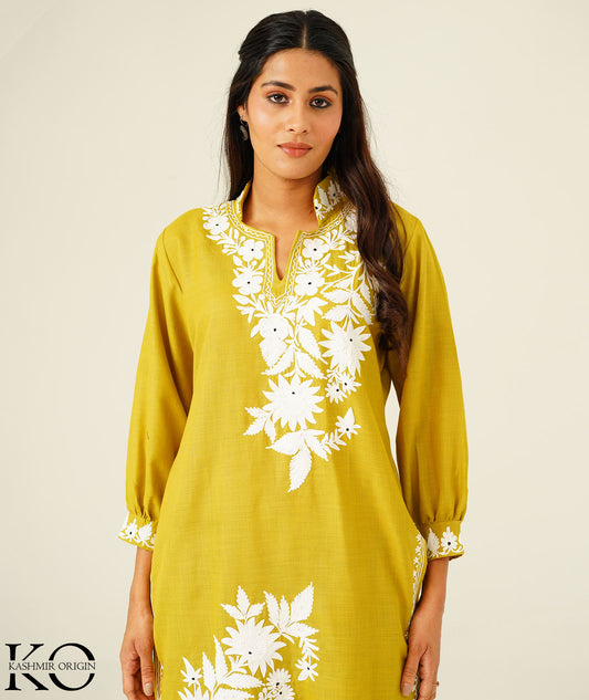 Sun Yellow & White Aari Embroidered Kashmiri Co Ord Set