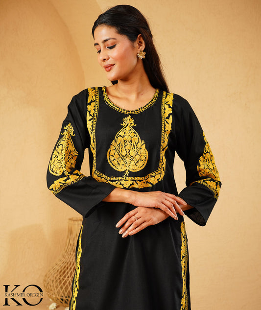 Black & Yellow Aari Embroidered Square Neck Design Kashmiri Co Ord Set
