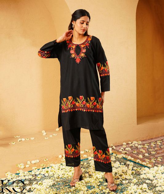 Black Tulip Design Aari Embroidered Kashmiri Co Ord Set