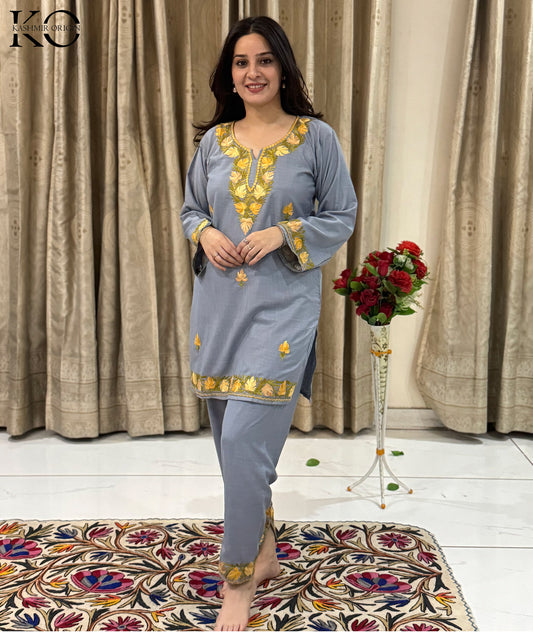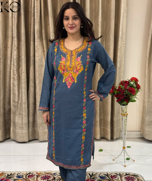Shop our exquisite Kashmiri Aari Embroidered Co-ord Set. This full suit features intricate hand embroidery, showcasing the rich craftsmanship of Kashmiri artisans.