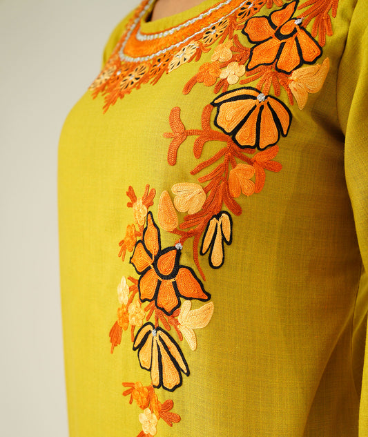 Sun Yellow Round Neck Design Aari & Zari Embroidered Kashmiri Co Ord Set
