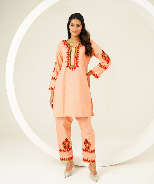 Peach Aari Embroidered Modern Design Kashmiri Co Ord Set