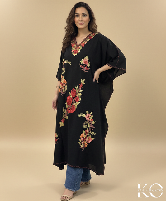 Black Aari Embroidered Plant Design Kashmiri Crush Cotton Kaftan | Special Cotton fabric for Hot Summers