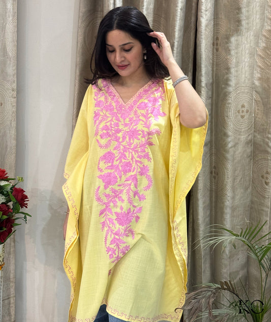 Yellow & Pink Floral Aari Embroidered Ruby Cotton Kaftan | Summer Kaftan | Best Quality Kaftans