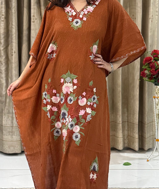 Brown Floral Design Aari Embroidered Kashmiri Crush Cotton Kaftan | Special Cotton fabric for Hot Summers