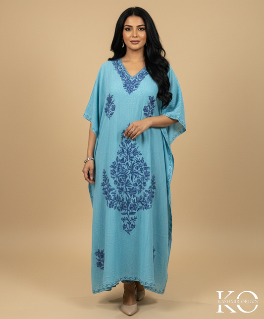 Skyblue Aari Embroidered Kashmiri Crush Cotton Kaftan | Special Cotton fabric for Hot Summers