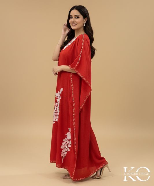 Red & White Aari Embroidered Kashmiri Cotton Kaftan | Special Cotton fabric for Hot Summers