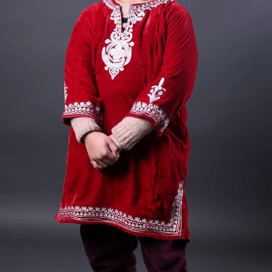 Red Base Tilla Embroidery Velvet Phiran For Kids