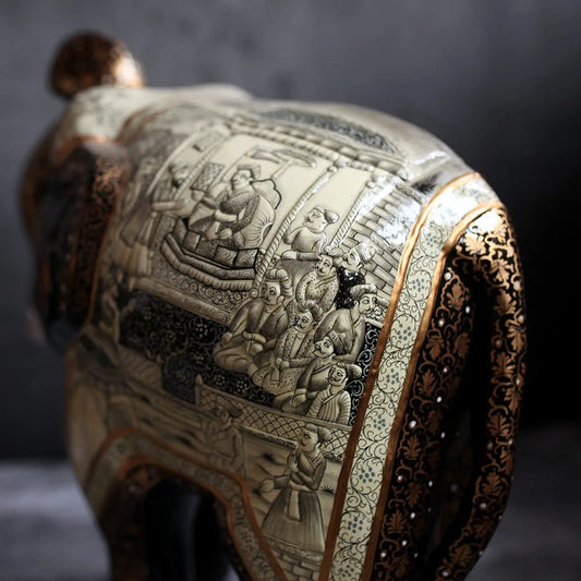 Embossed Gold base Mughal Darbar Paper Mache Elephant Set of 3 | Big Small Medium Size Elephants | Golden color Made from pure gold