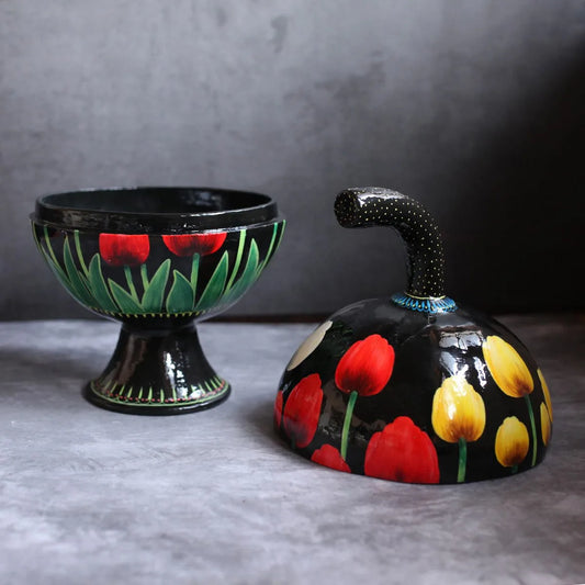 Pumpkin shape Tulip design handmade Paper Mache Fruit Bowl 15 x 9 INCHES | Kashmiri hand painted | Kashmir Art