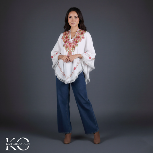 White Poncho Floral Design with Kashmir Aari Embroidery