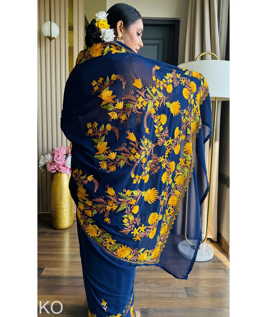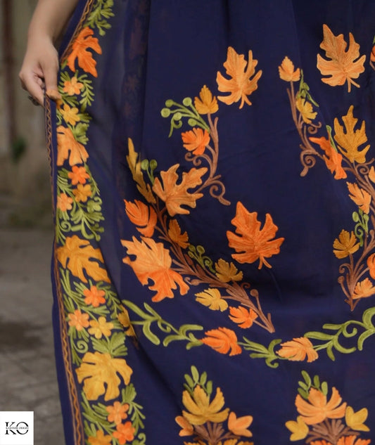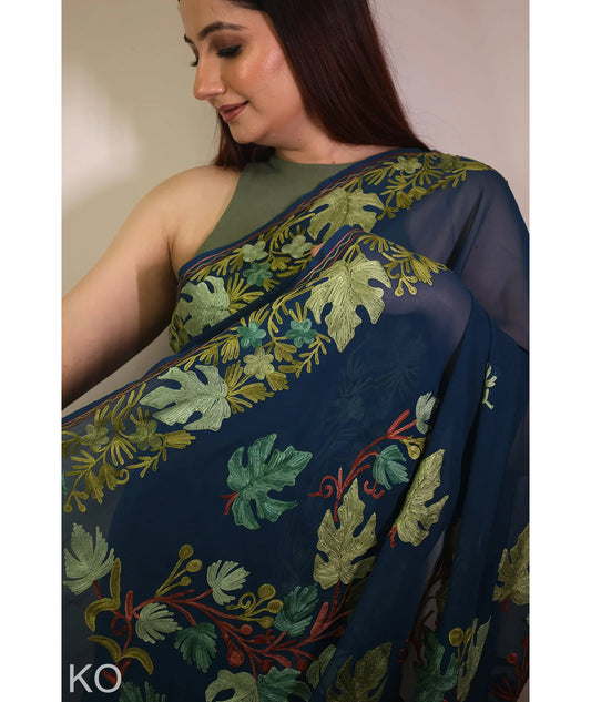 Autumn Chinar Blue Aari Embroidered Georgette Saree