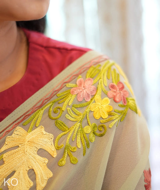 Chinar Aari Embroidered Light Grey Olive Georgette Saree