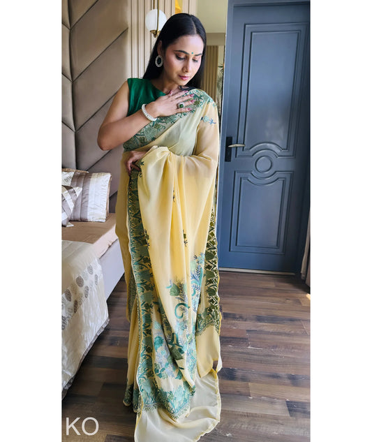 Green Tulips Aari Embroidered yellow Georgette Saree