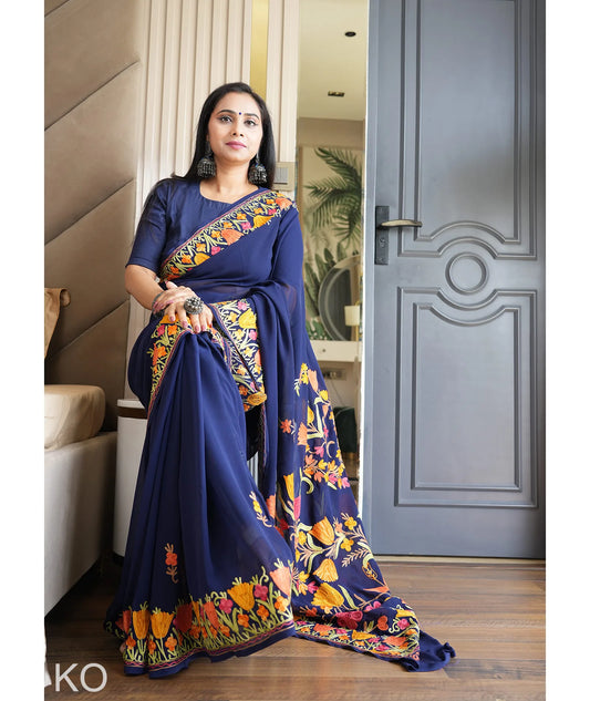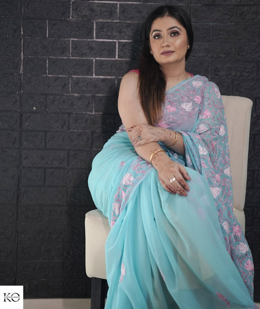 Tulip Design Aari Embroidered Blue Georgette Saree