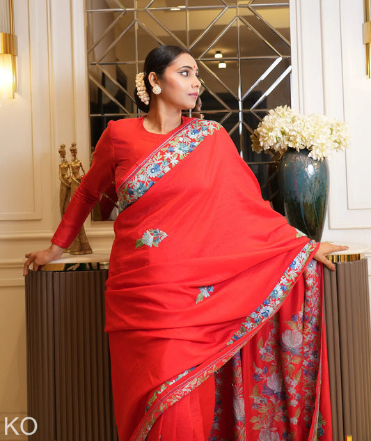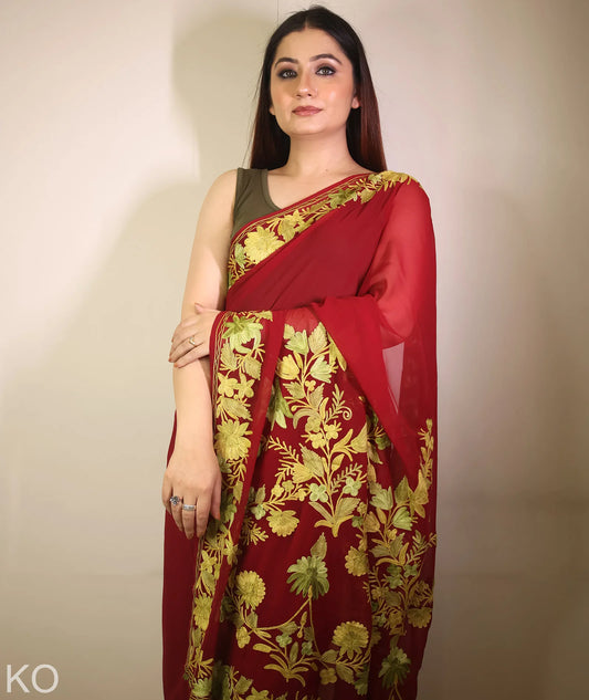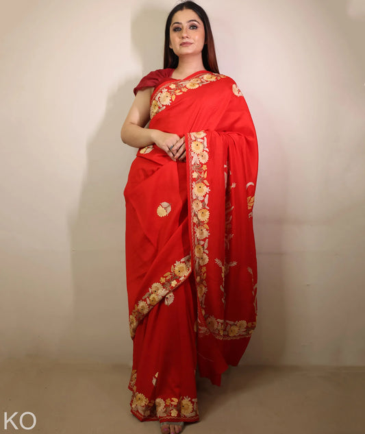 Red Top Seller Multifloral Aari Embroidered Kashmiri Pure Crepe Saree