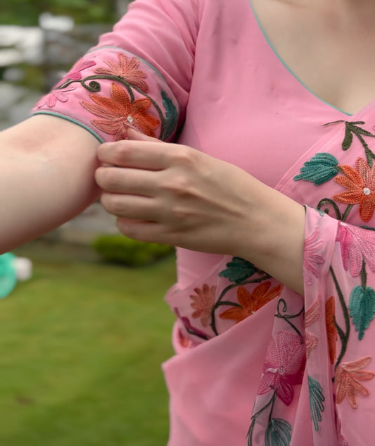 Baby Pink Floral Design Aari Embroidered Georgette Saree