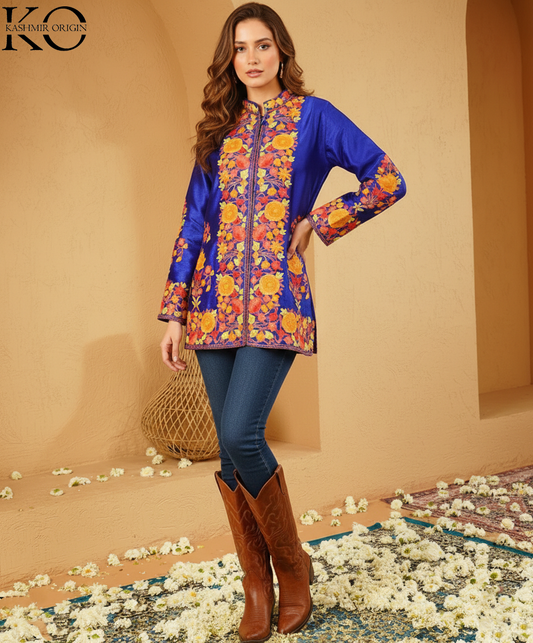 Royal Blue Aari Embroidered Kashmiri Short Silk Jacket |Silk Jacket for women | Short Jackets | Made in kashmir