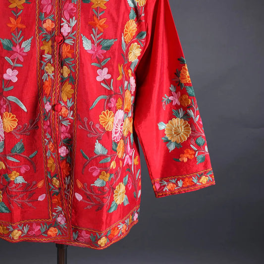 Red Base Floral Design Aari Embroidery kashmiri Silk Jacket | Silk Jacket for women | Short Jackets | Made in kashmir
