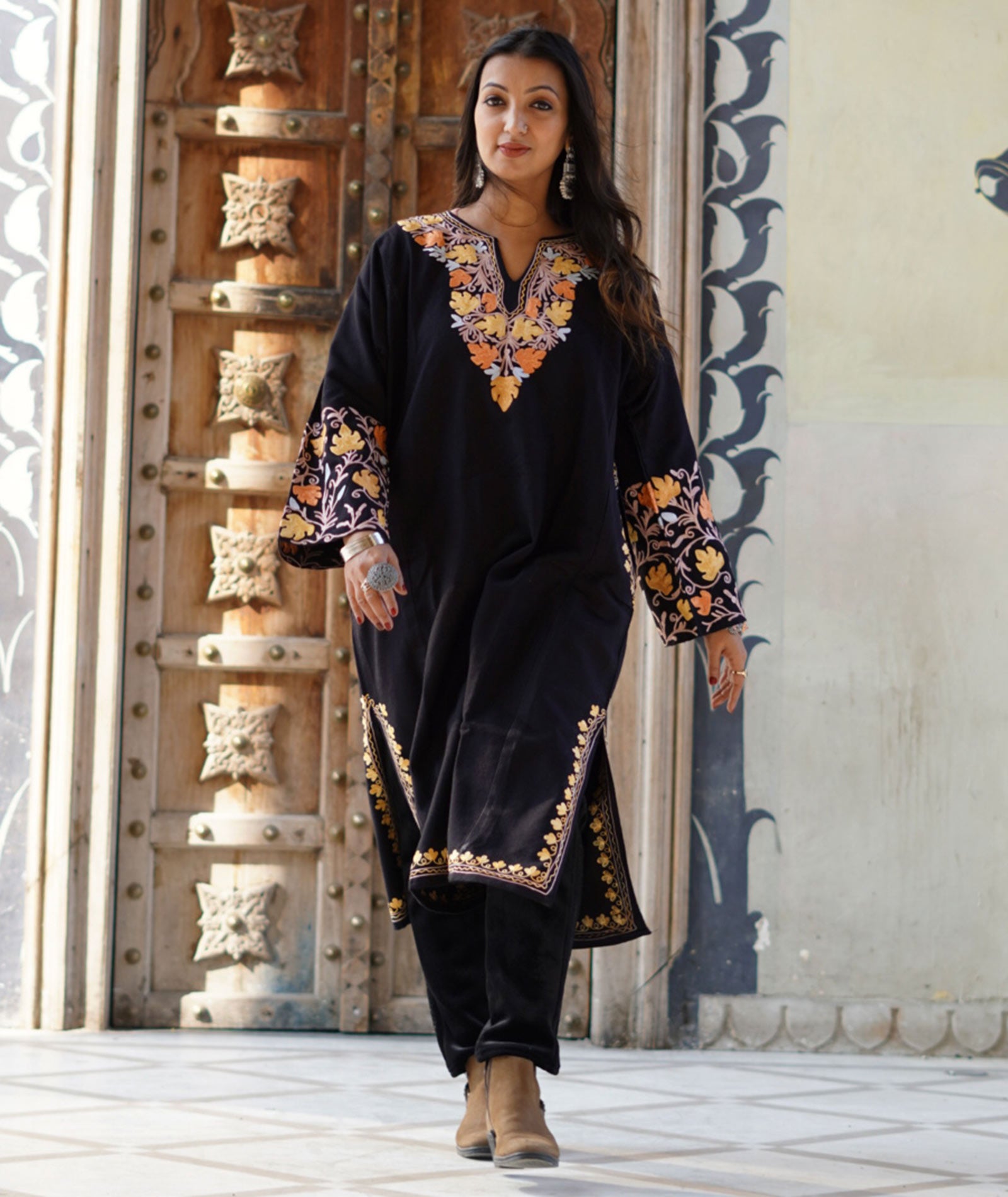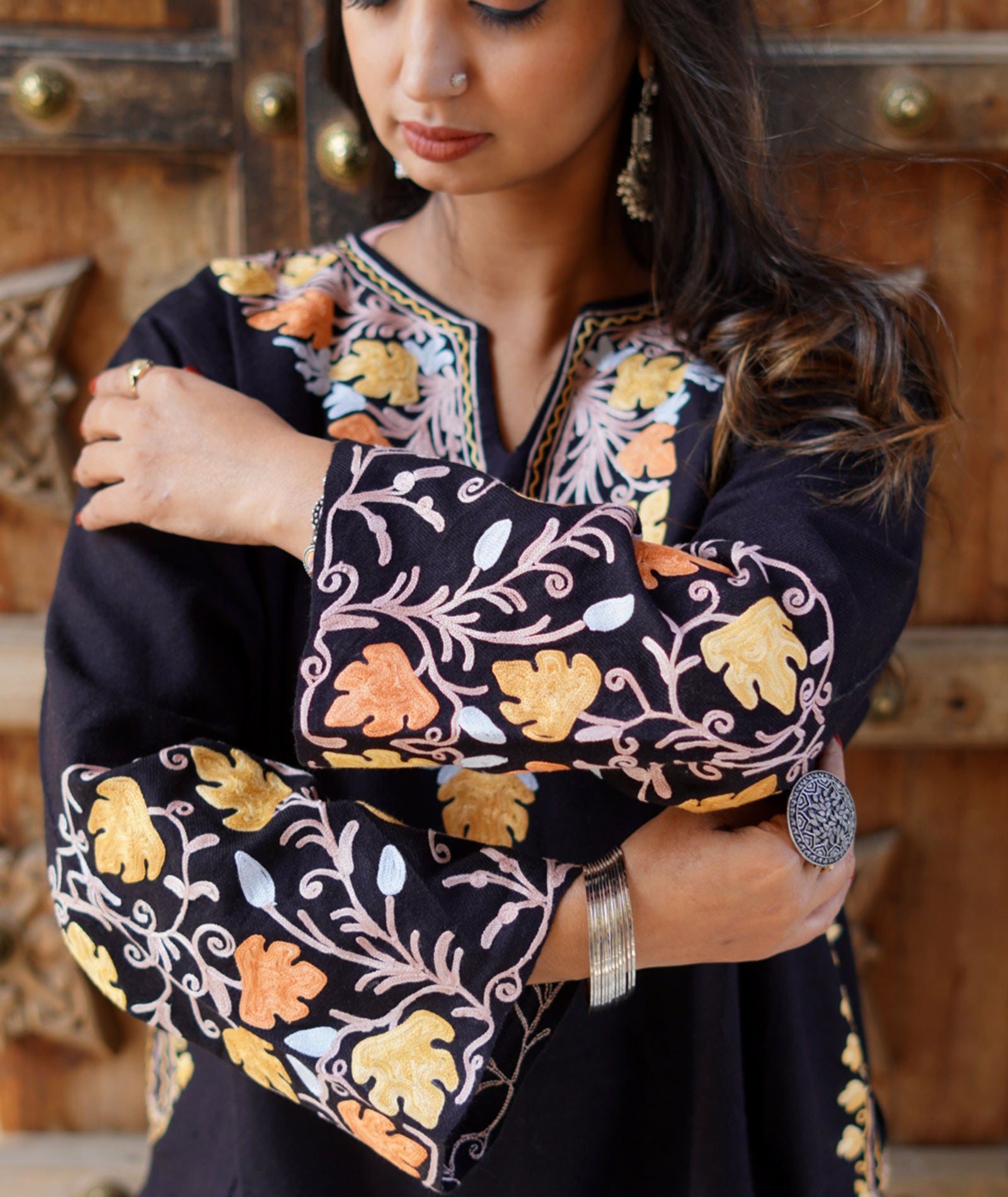 This traditional craftsmanship and ancestral technique of crafting clothes is known as the Kashmiri embroidery. This craft has evolved over centuries with different techniques and designs being used to create the truly unique Kashmiri Pheran. The Black Aari woolen Pheran is a great example of such craft. The main feature of Kashmiri embroidery is the use of a single hook needle to produce intricate and delicate designs.