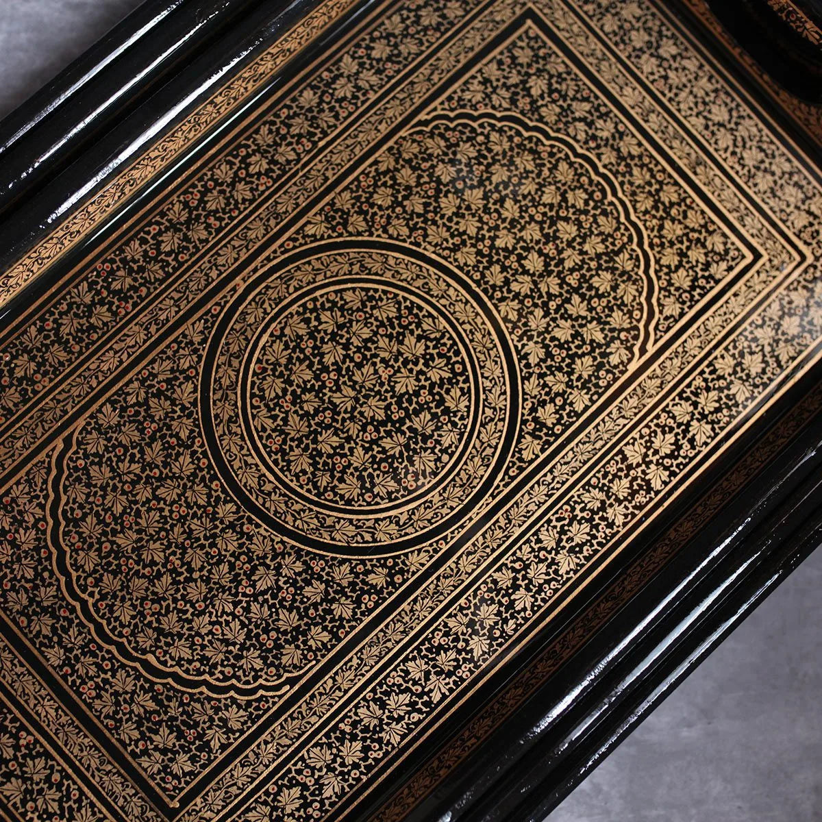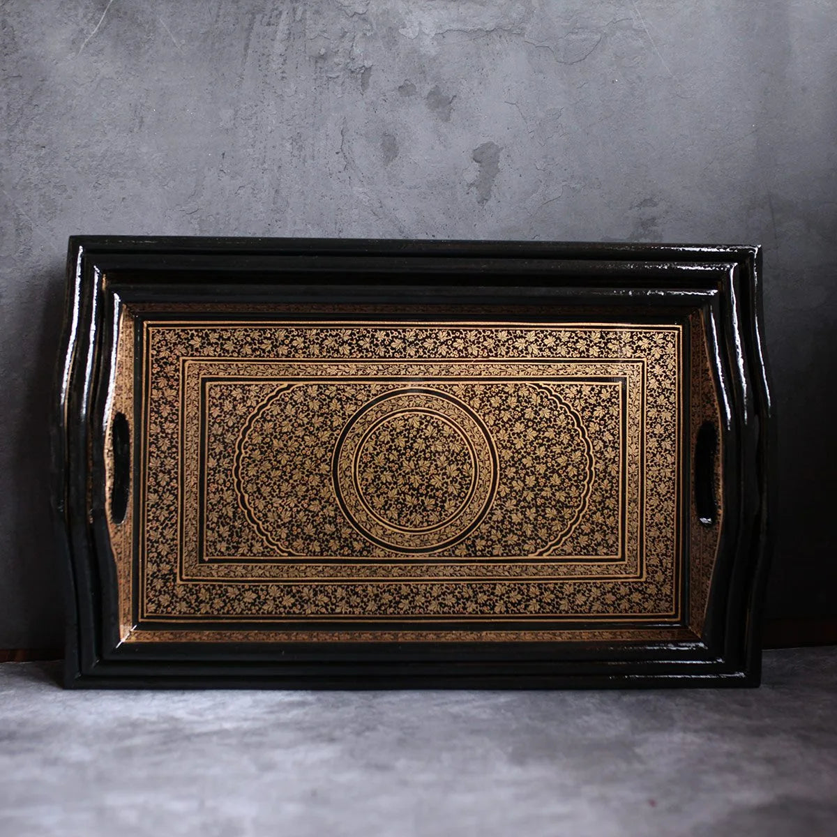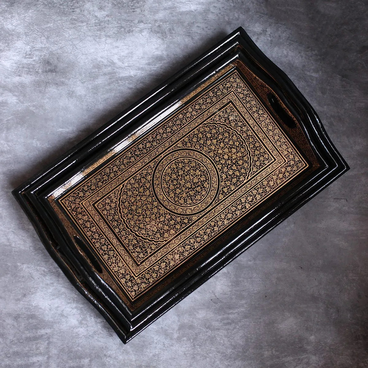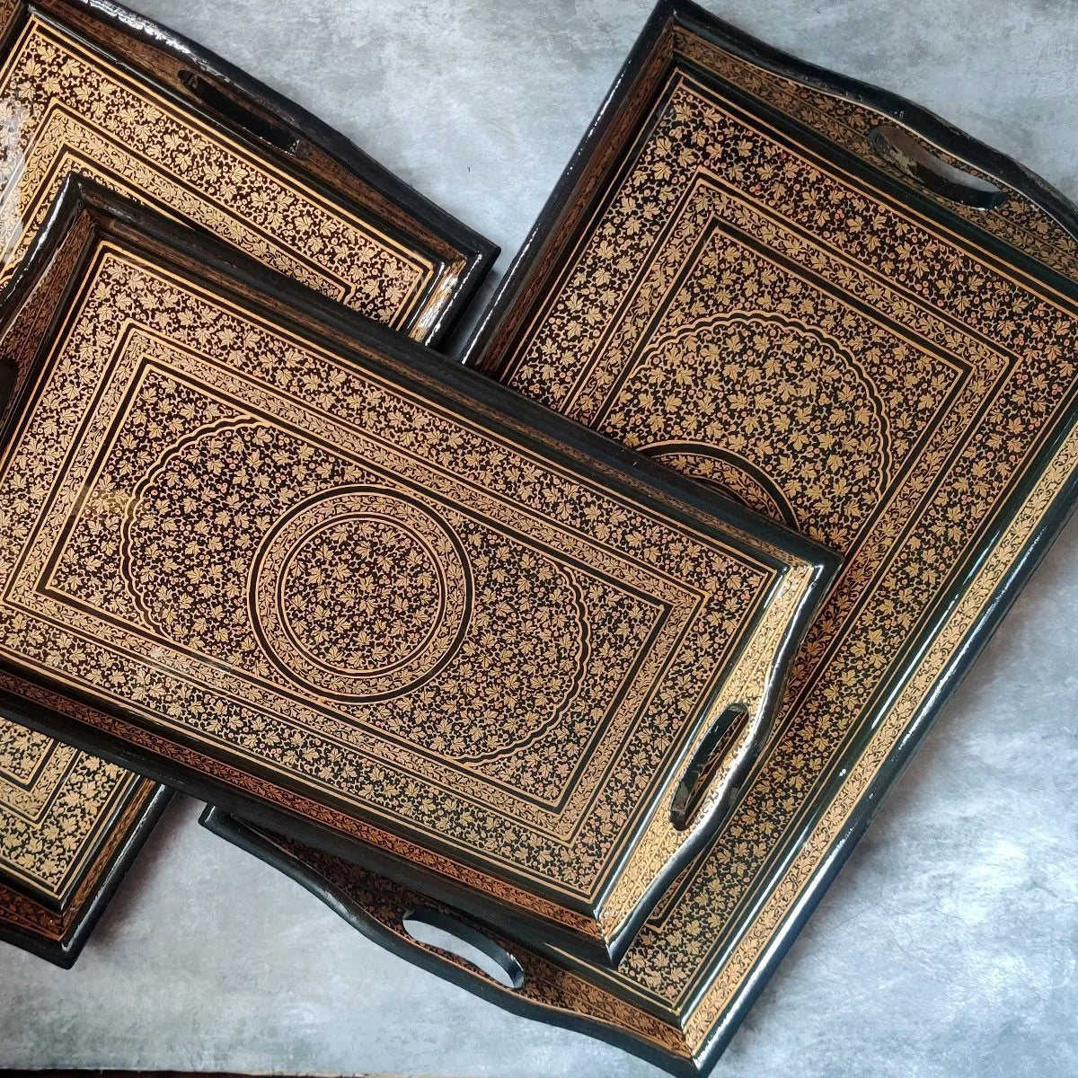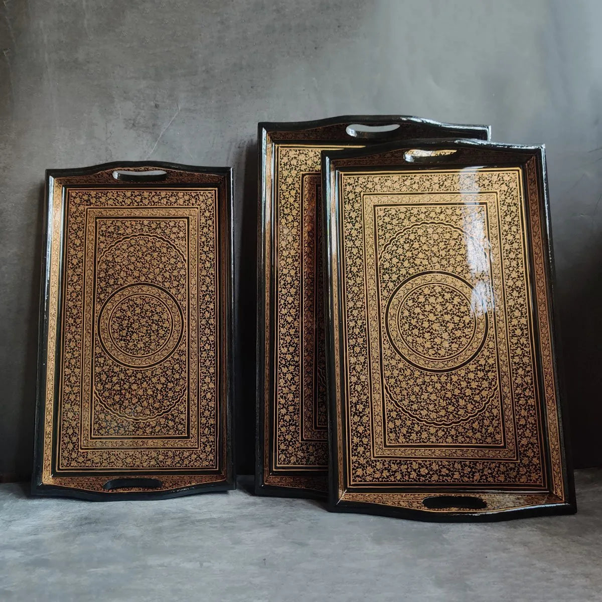 Black base gold work tradational design Wood base Paper Mache Tray Set of 3 | Handmade Paper Mache | Intense Design kashmir Art