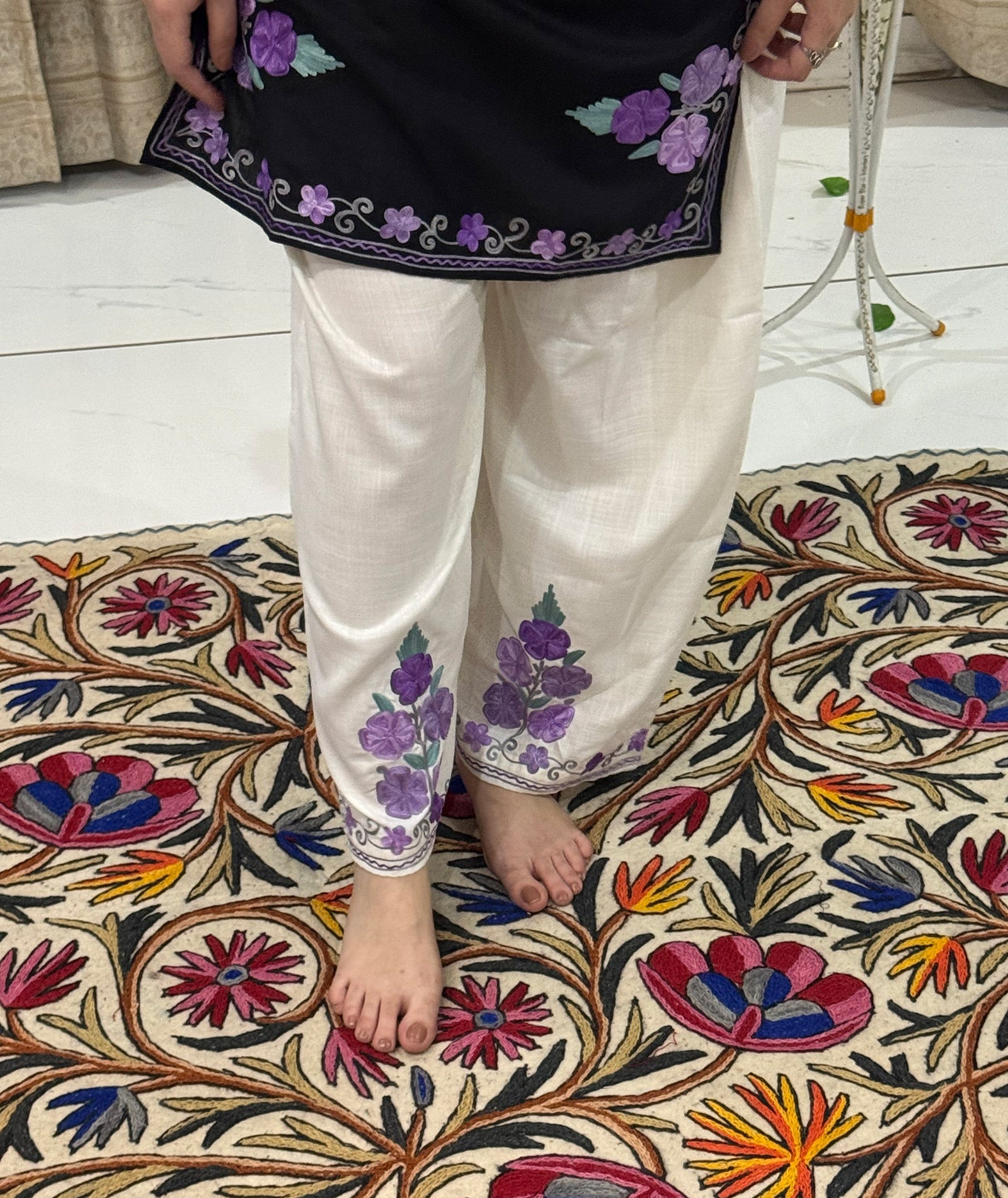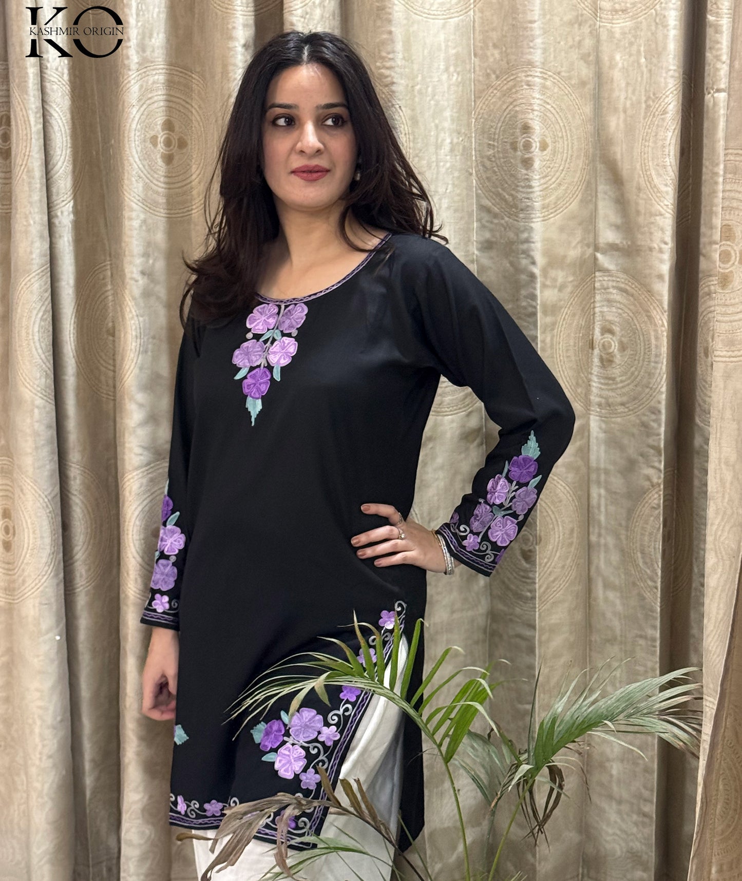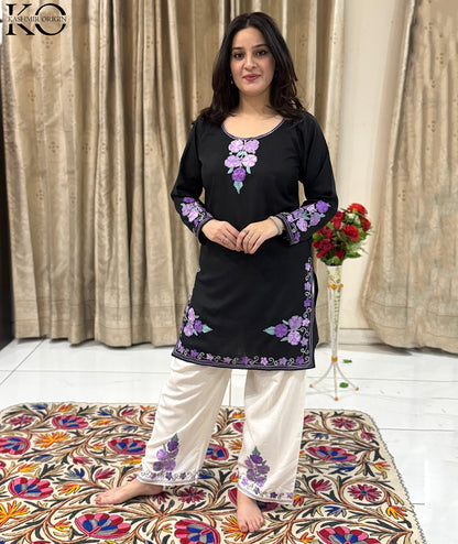 Elevate your style with this stunning co ord set from Kashmir Origin. The combination of black and white with a pop of purple adds a touch of sophistication to this traditional Aari embroidered design. Made from high-quality cotton, this set is not only stylish but also comfortable to wear.
