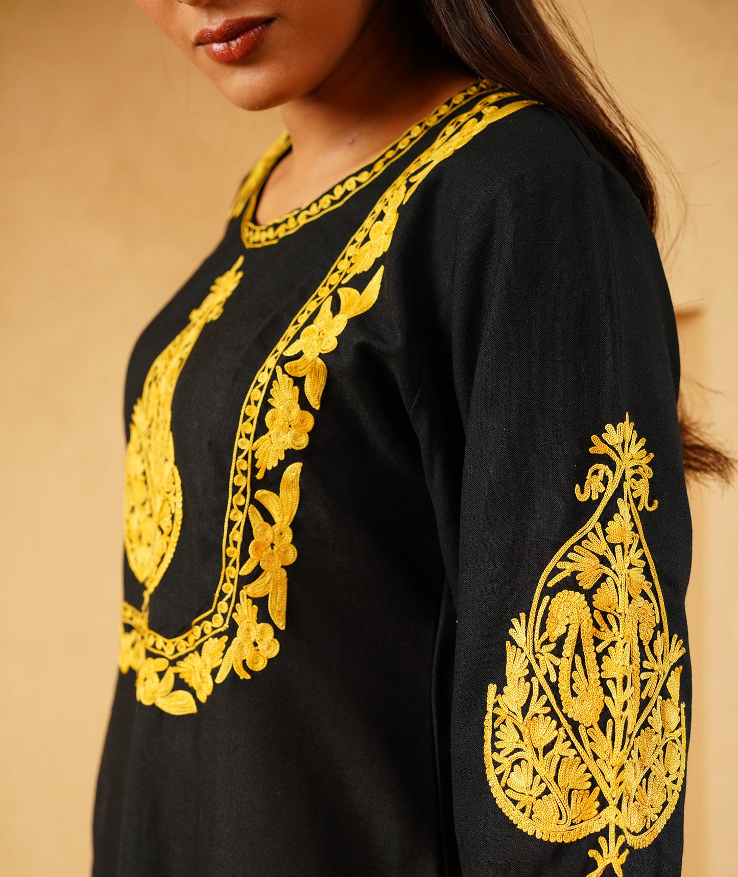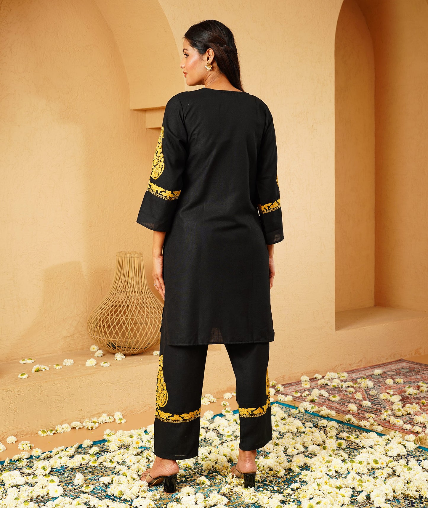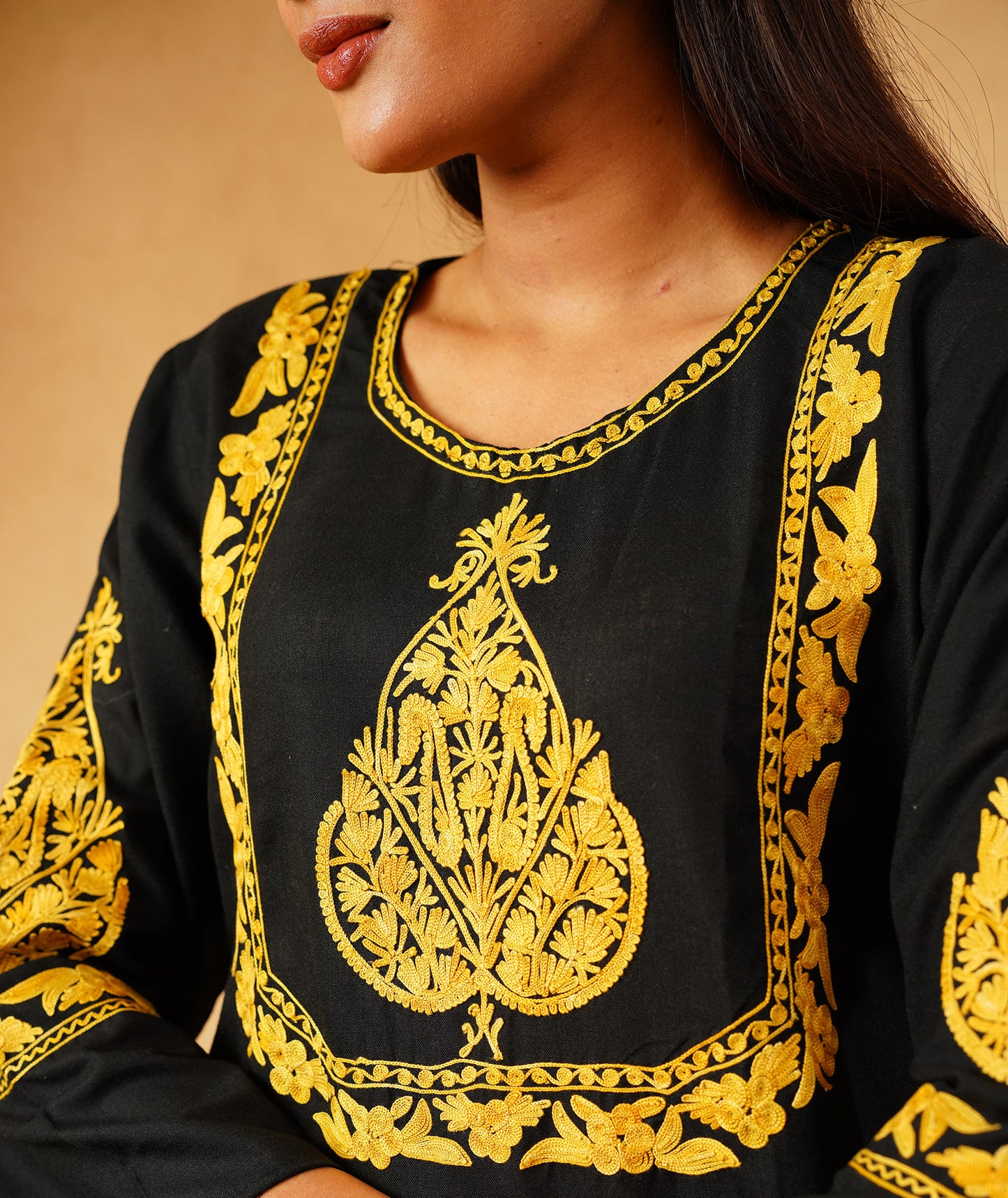 Black & Yellow Aari Embroidered Square Neck Design Kashmiri Co Ord Set