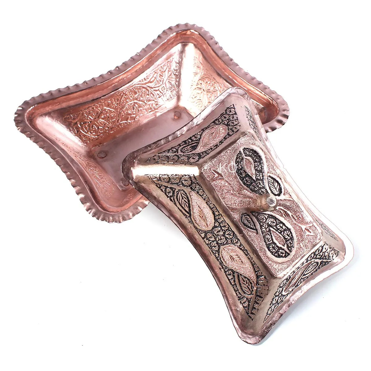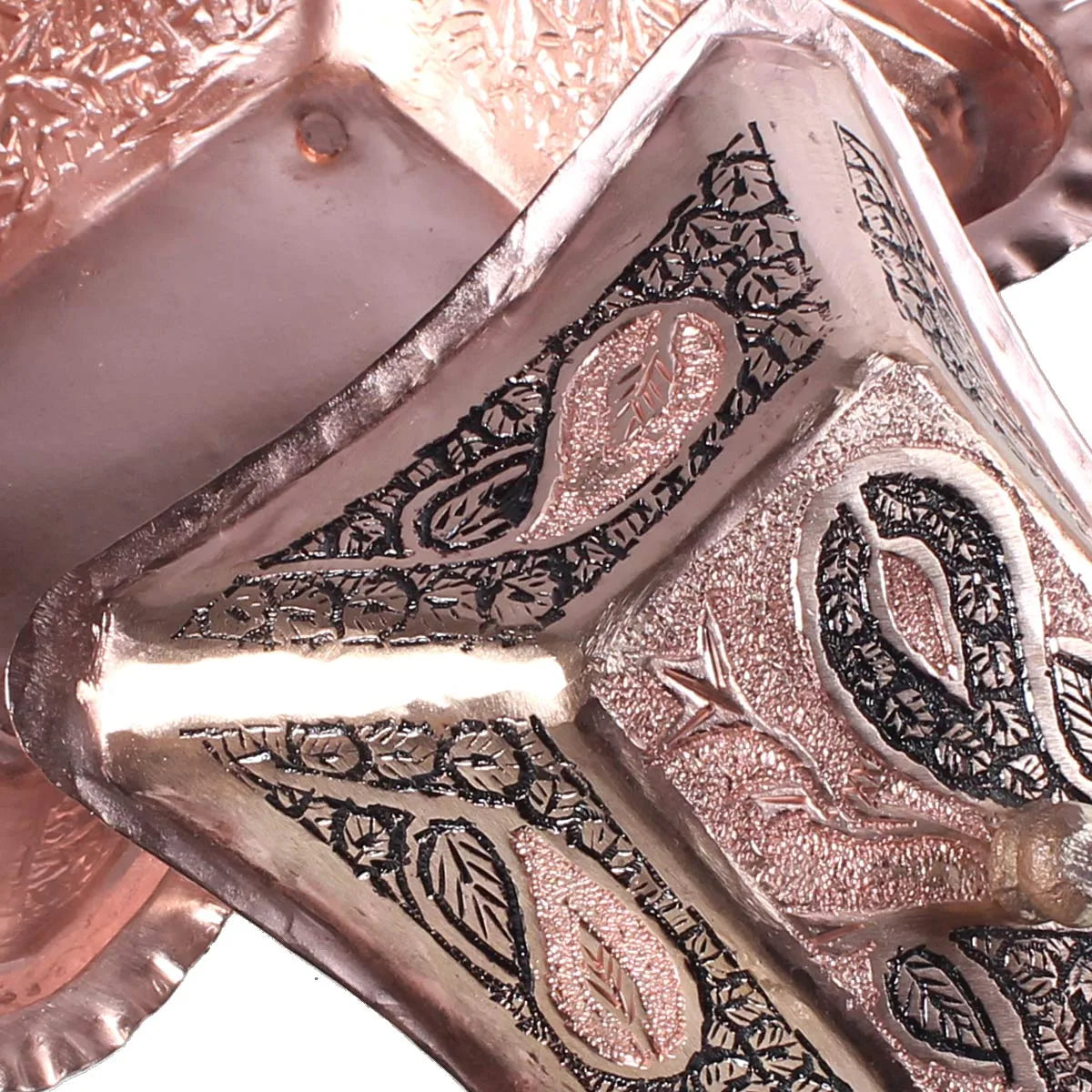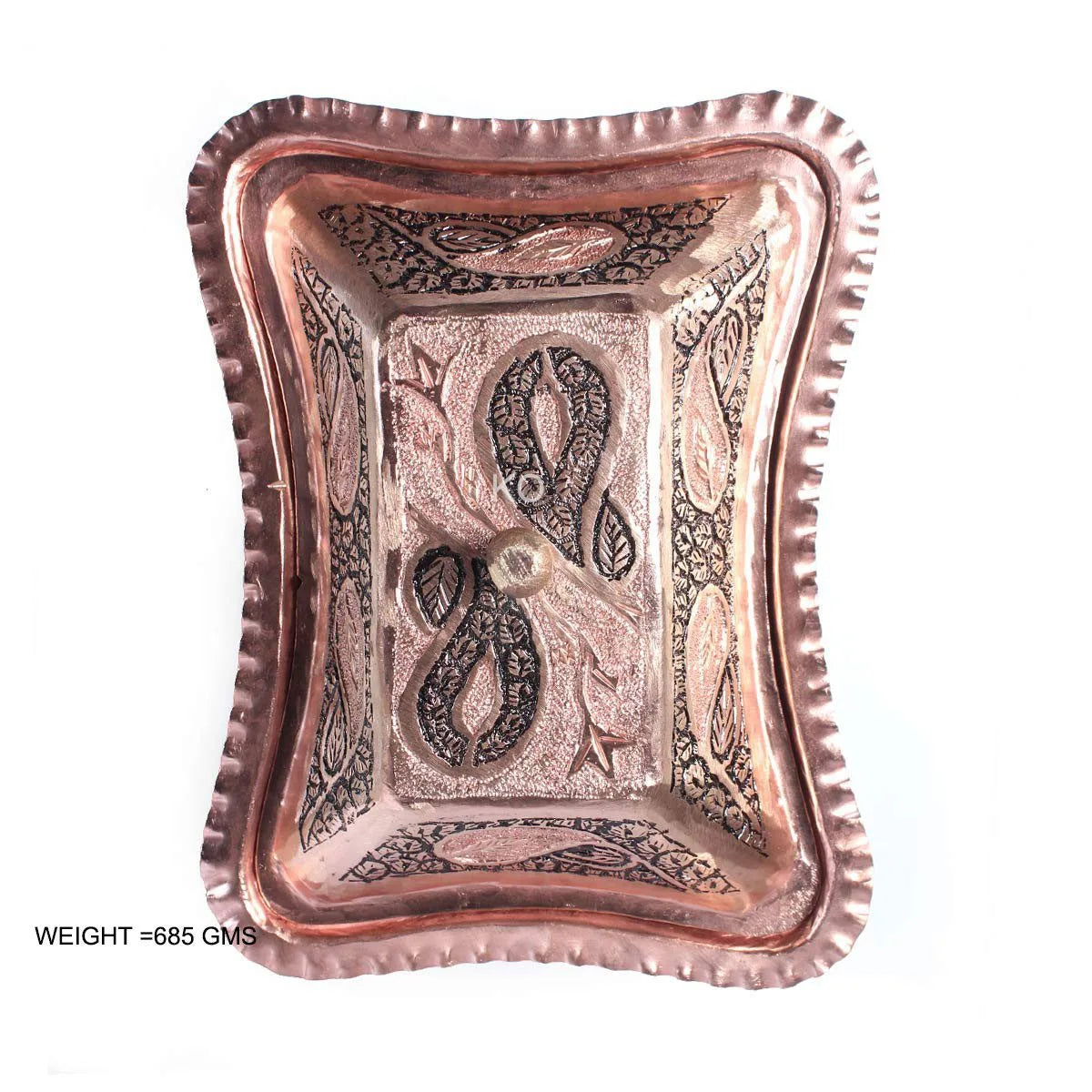 The process of making copper goes through many artisans who are specialized in a particular technique. The process involves Khar ? the smith, Naqash ? the engraver, Zarcod ? the gilder, Roshangar ? the polisher, and Charakgar ? the cleaner or finisher. In fact, specific localities or Mohallas like Roshangar-Mohalla are named after these professions, where these artisans still carry out their craft practice. The age-old art of crafting copperware is deep-rooted in the culture here and is famous all over the world. The craftsmanship of Kashmir is known for the work of engraving and making household and decorative products from copper including utensils like Lota (pot), Tream (plate), Naer (water jug), Tash-Near (portable handwash), dishes, bowls, trays, vessels,haandi, Lamp Shades and many more and the most famous being Kashmiri ?Samovar?- a traditional tea container or large cattle.