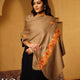 The timeless artistry of Kashmir weds the intricate craftsmanship in this fawn hued shawl, crafted from the softest, fine wool fibre.The shawl has been adorned with Aari embroidery in patterns of gold, rust and olive that run gracefully over the borders, adding vibrancy to its muted base. Each motif carries forward generations of craftsmanship and cultural legacy, perfect for your winter wardrobes, this winter season. Make this woolen shawl your companion for pre festive days, casual events, formal occasions, or gift it to your loved ones.