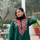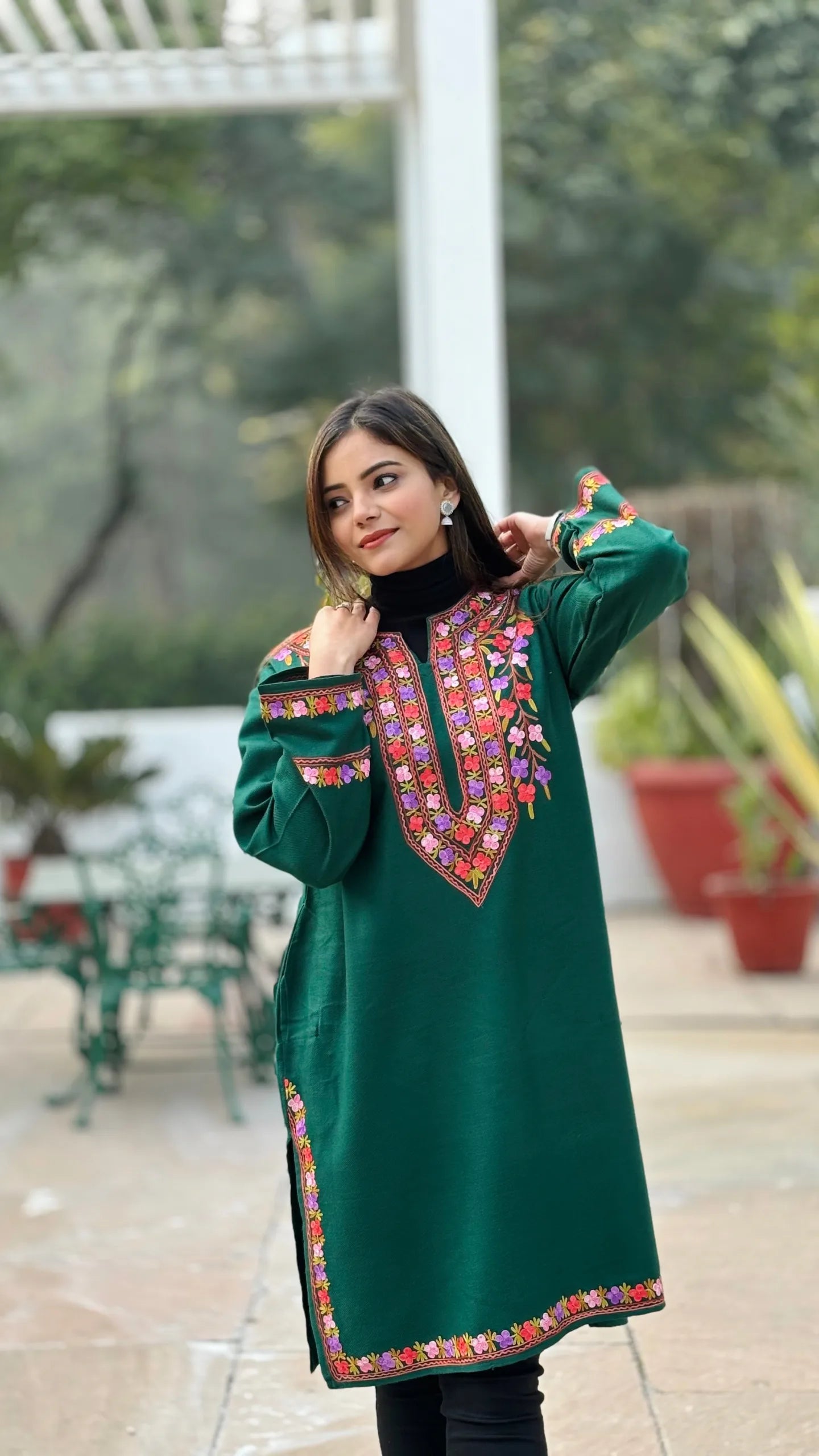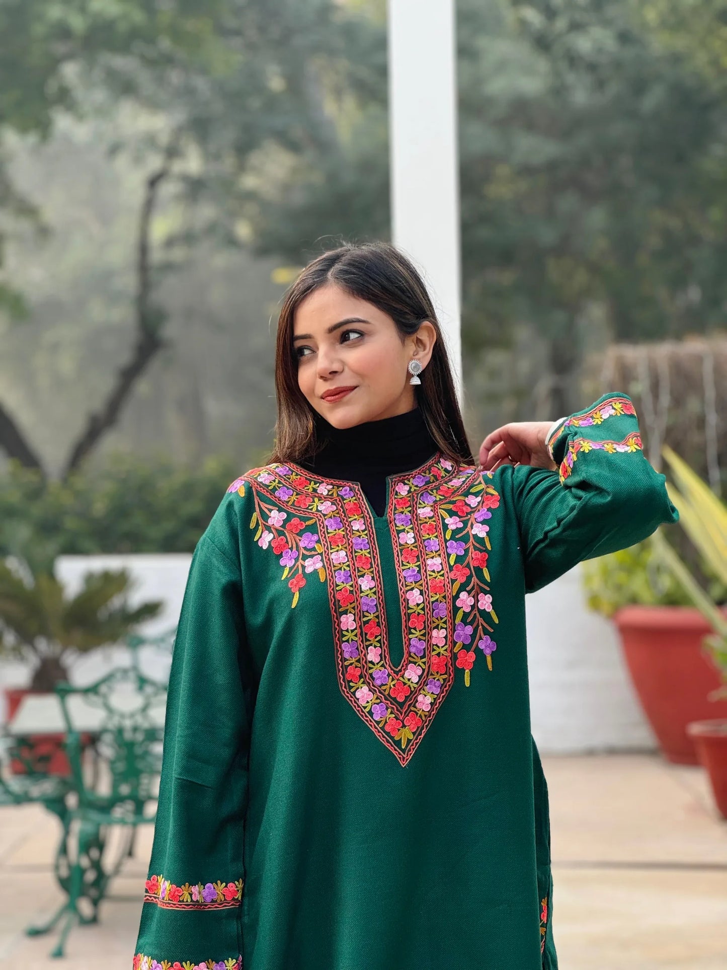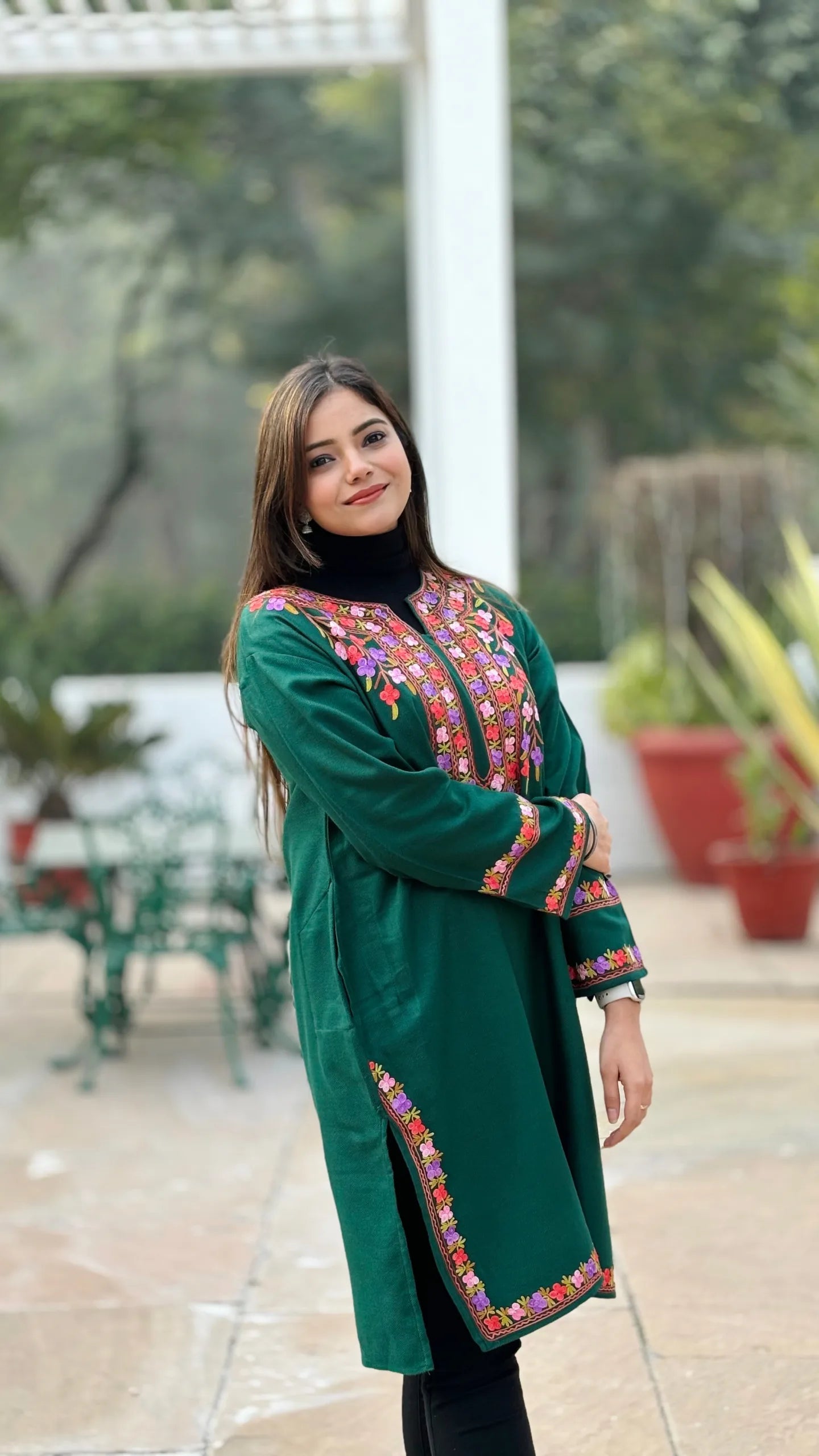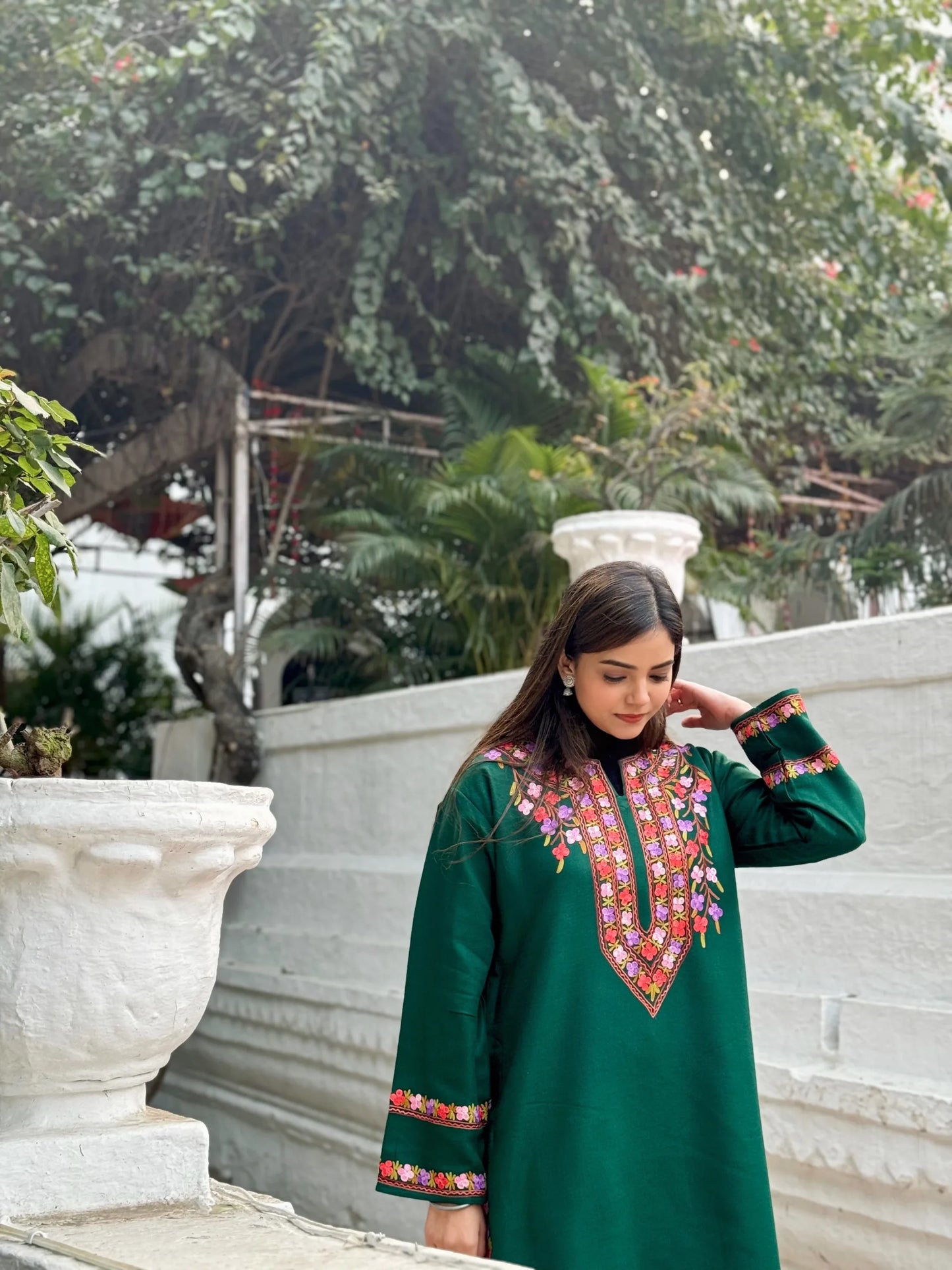 This Forest Green Aari Embroidered Pheran is a high-quality traditional garment from Kashmir, India. It boasts intricate aari work embroidery and a comfortable, versatile pheran style in a perfect fall/winter forest green color. Add traditional elegance to your wardrobe with this piece.