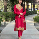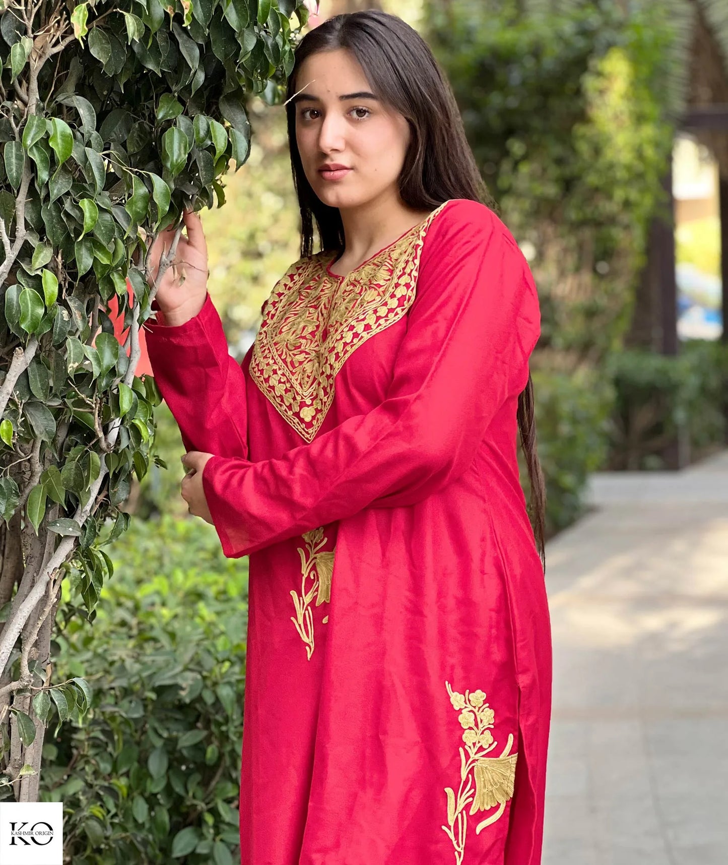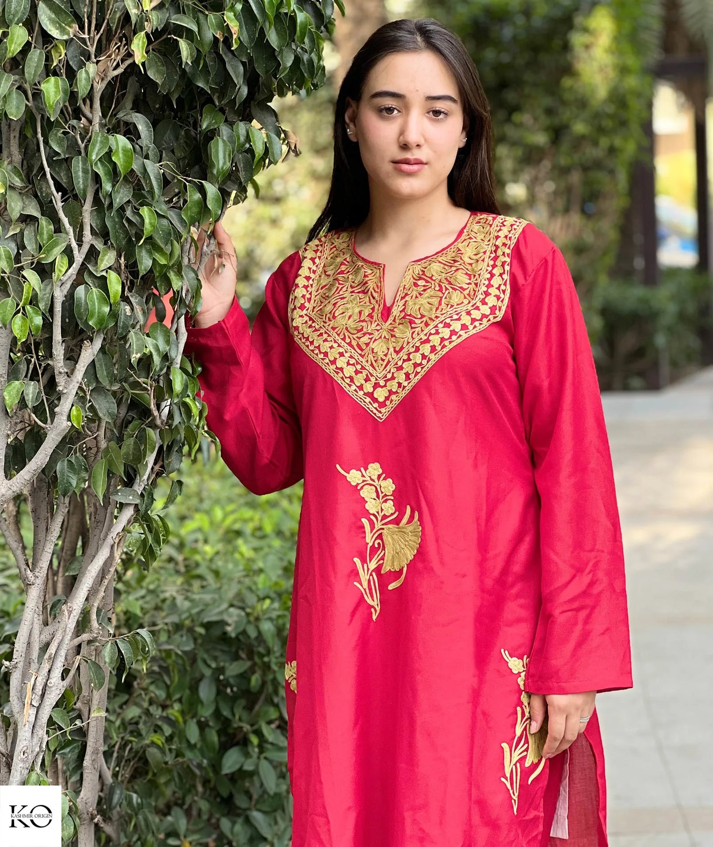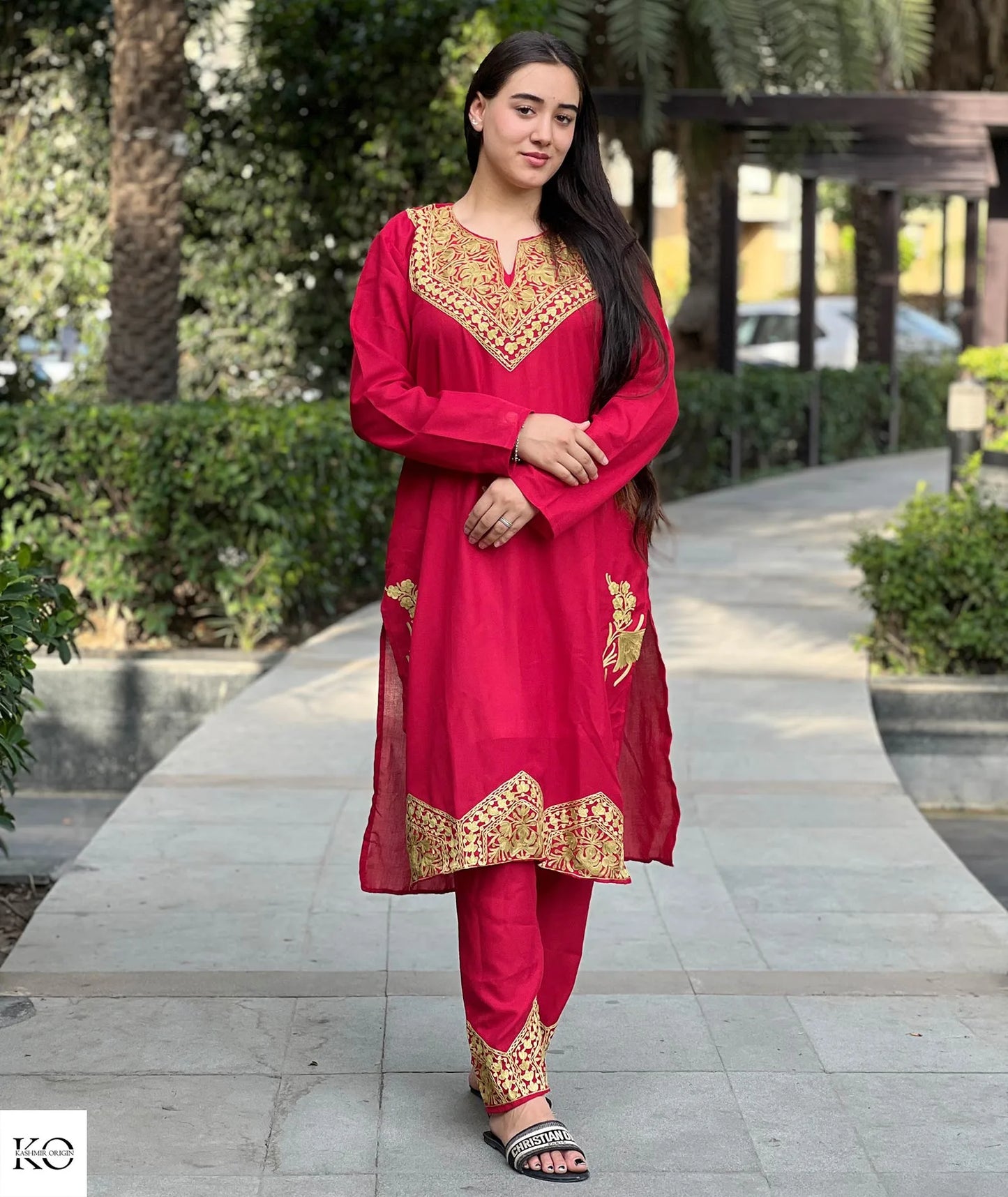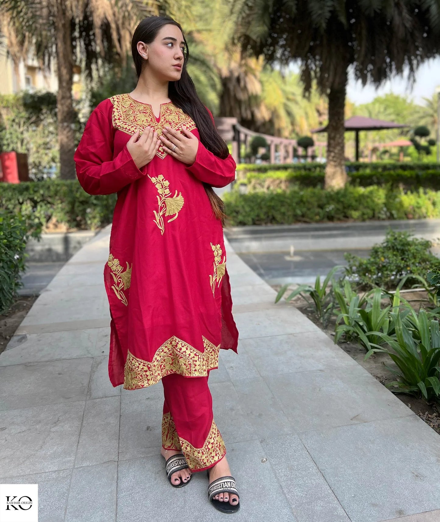 Green Embroidered Red Base Cotton Co ord Set | Full Suit