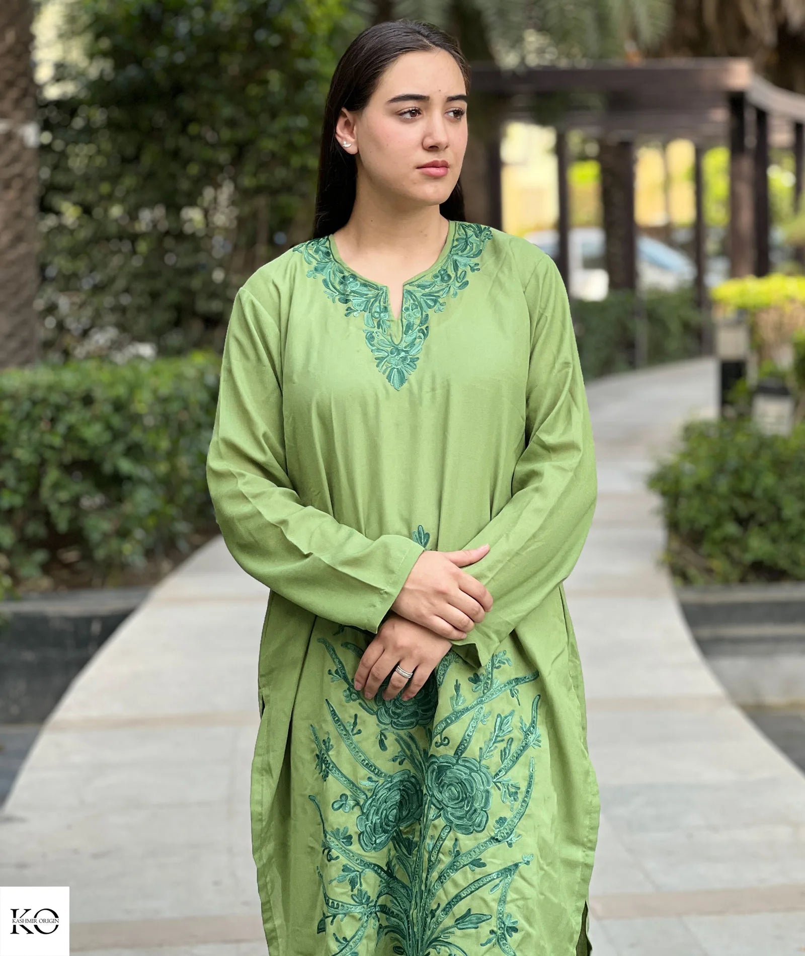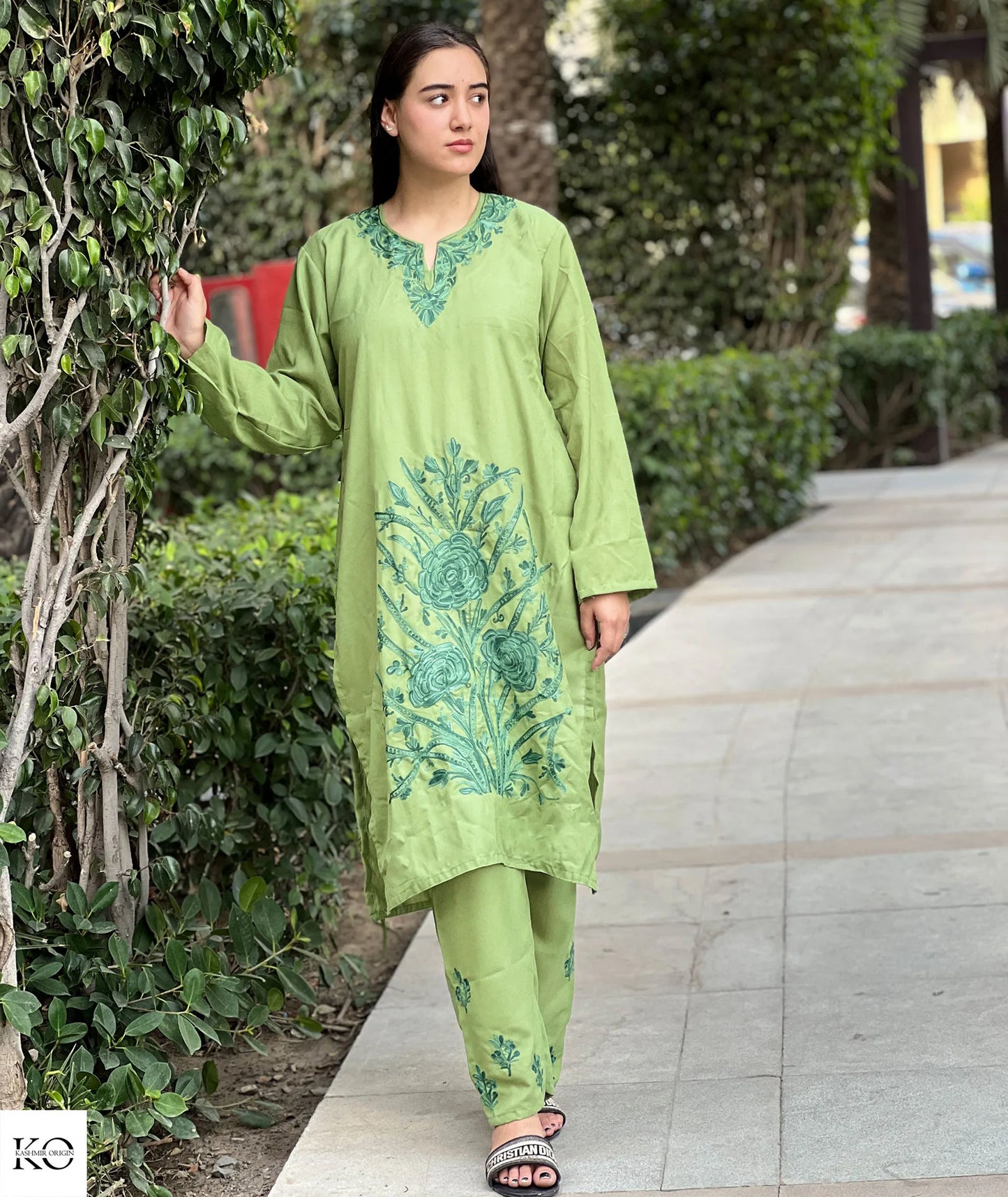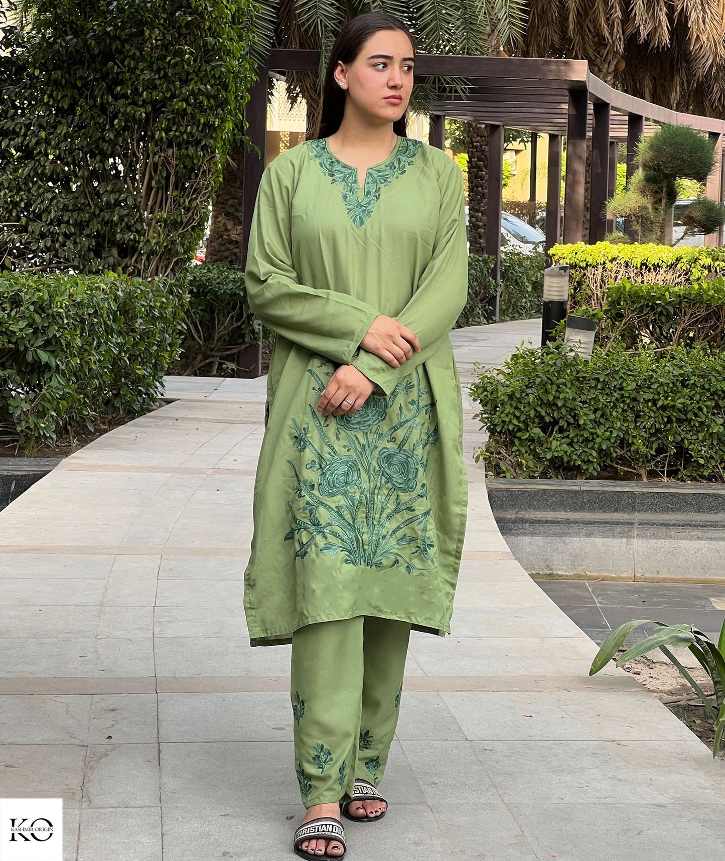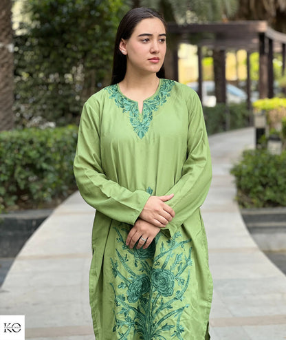 Green Tone on Tone Embroidered Cotton Co ord Set | Full Suit