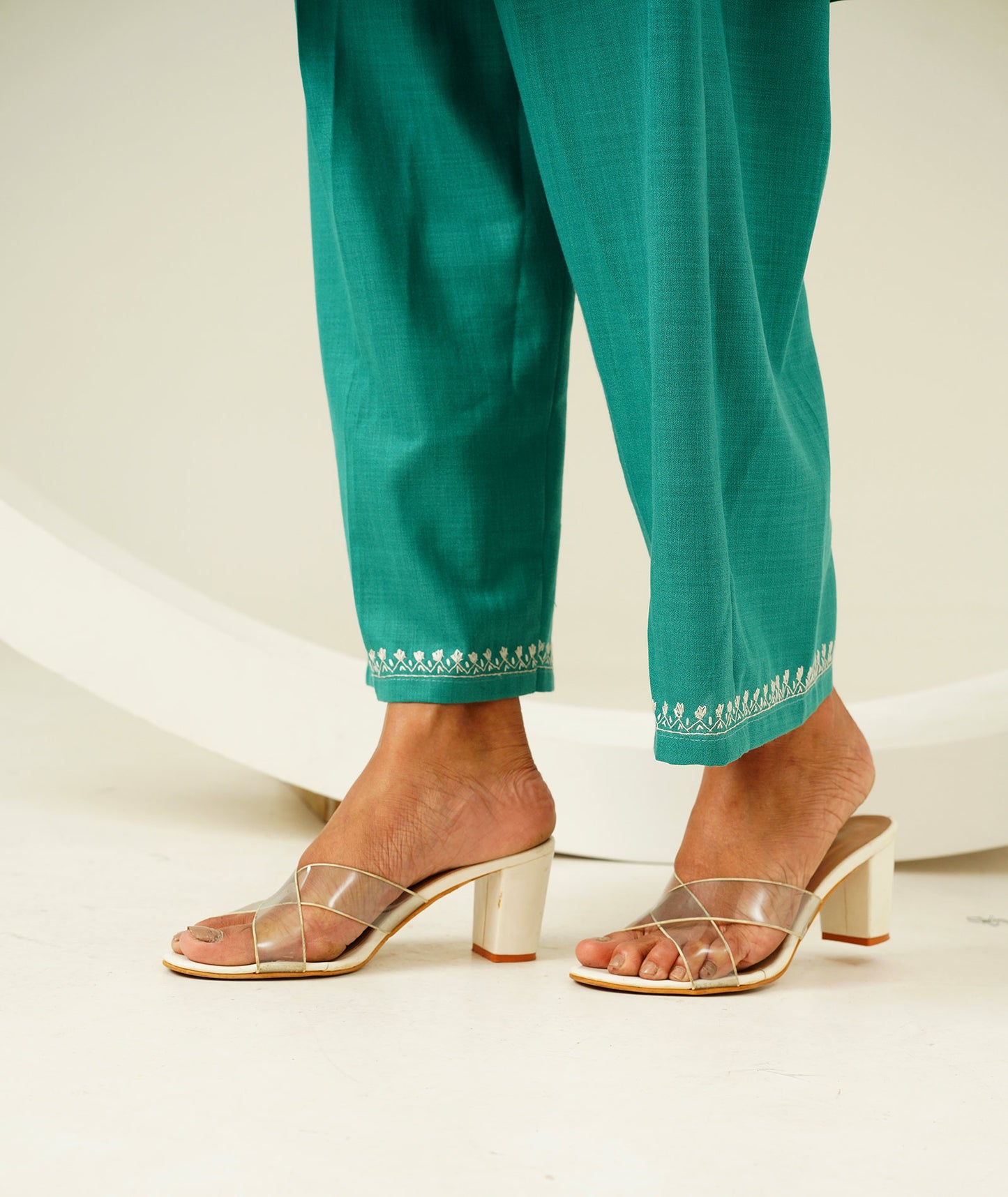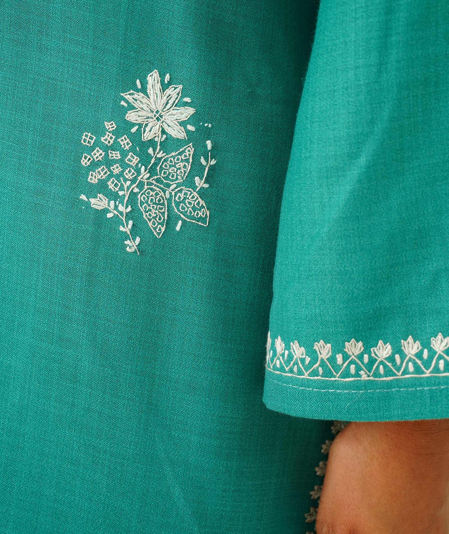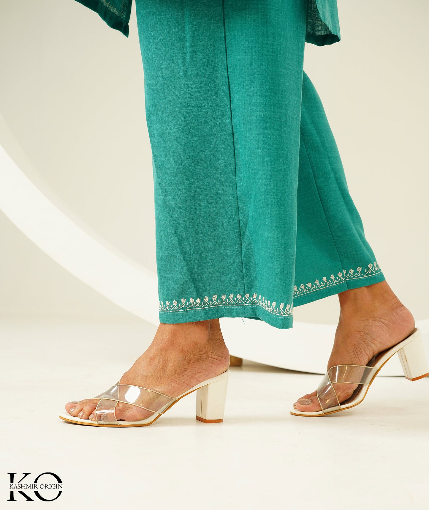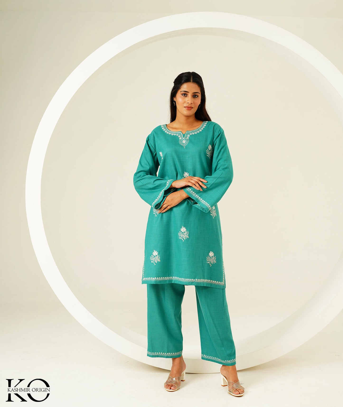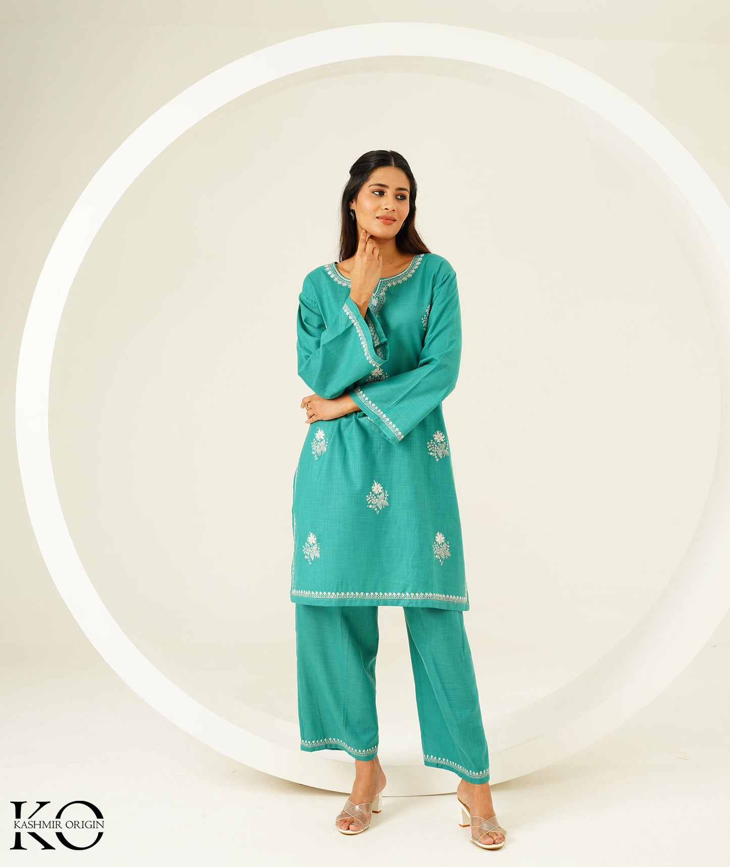 Hand Sozni Embroidered Jungle Green Bootidaar Kashmiri Co Ord Set