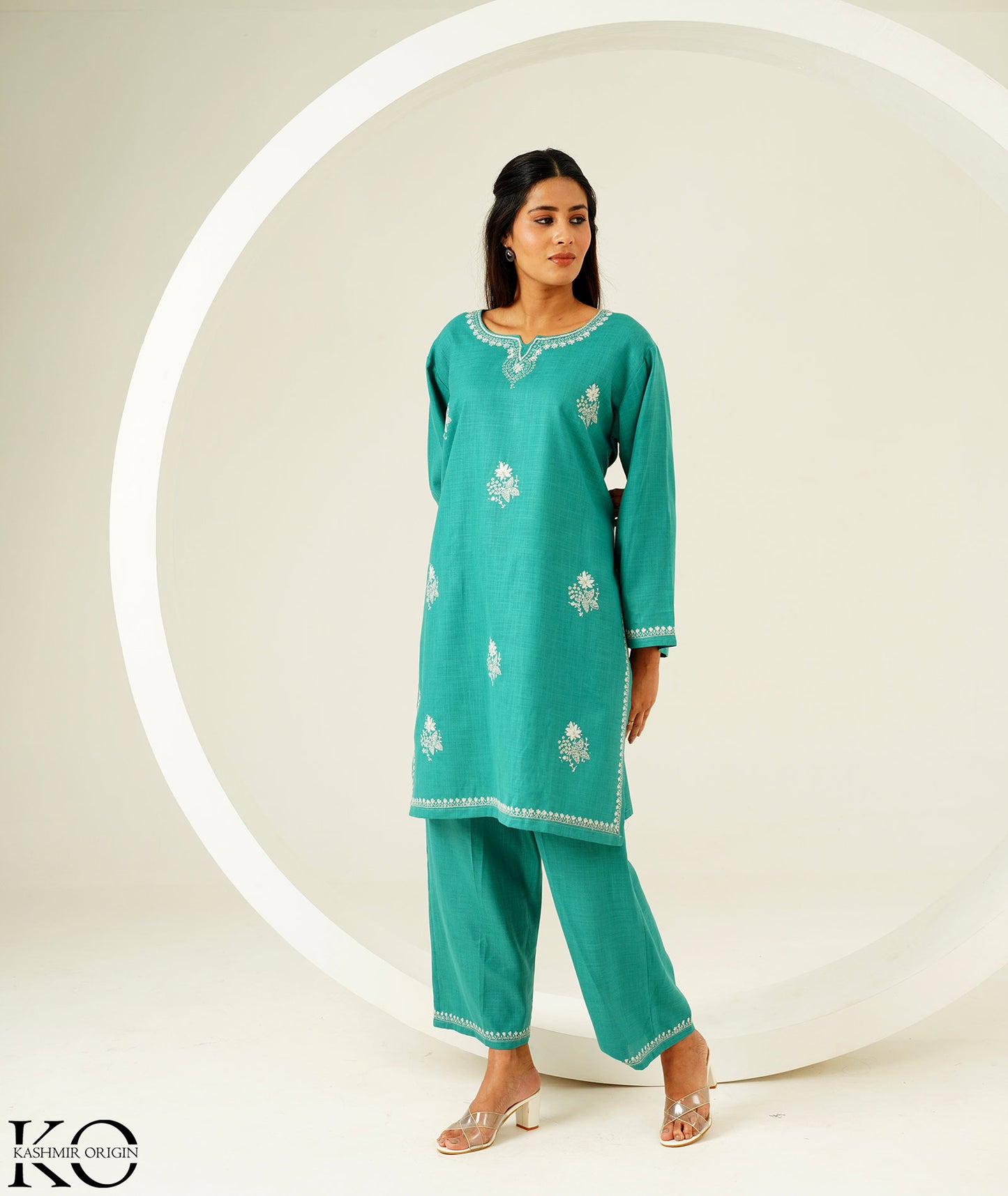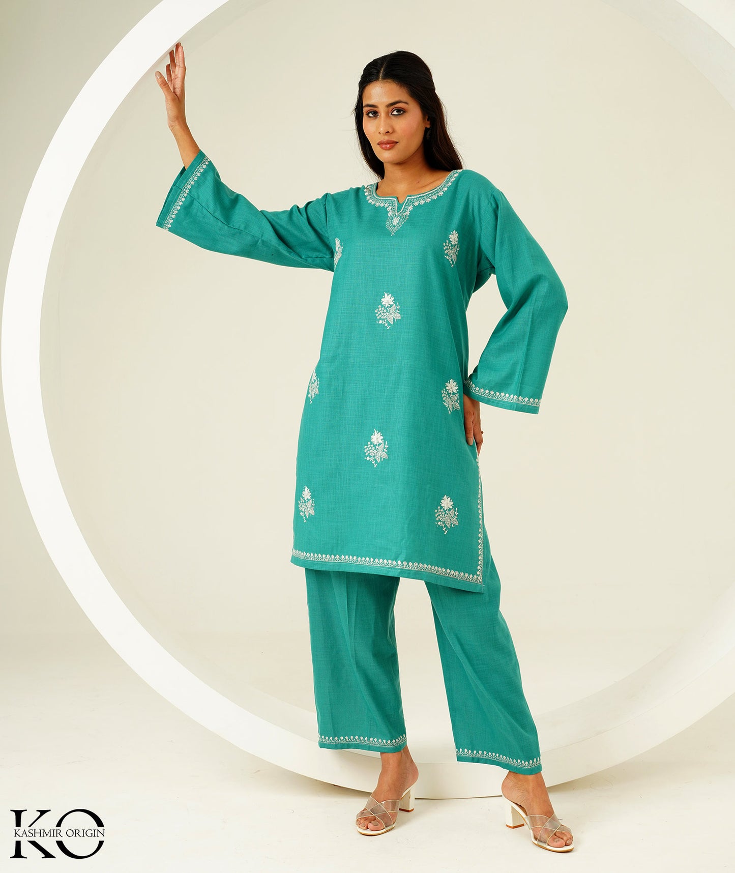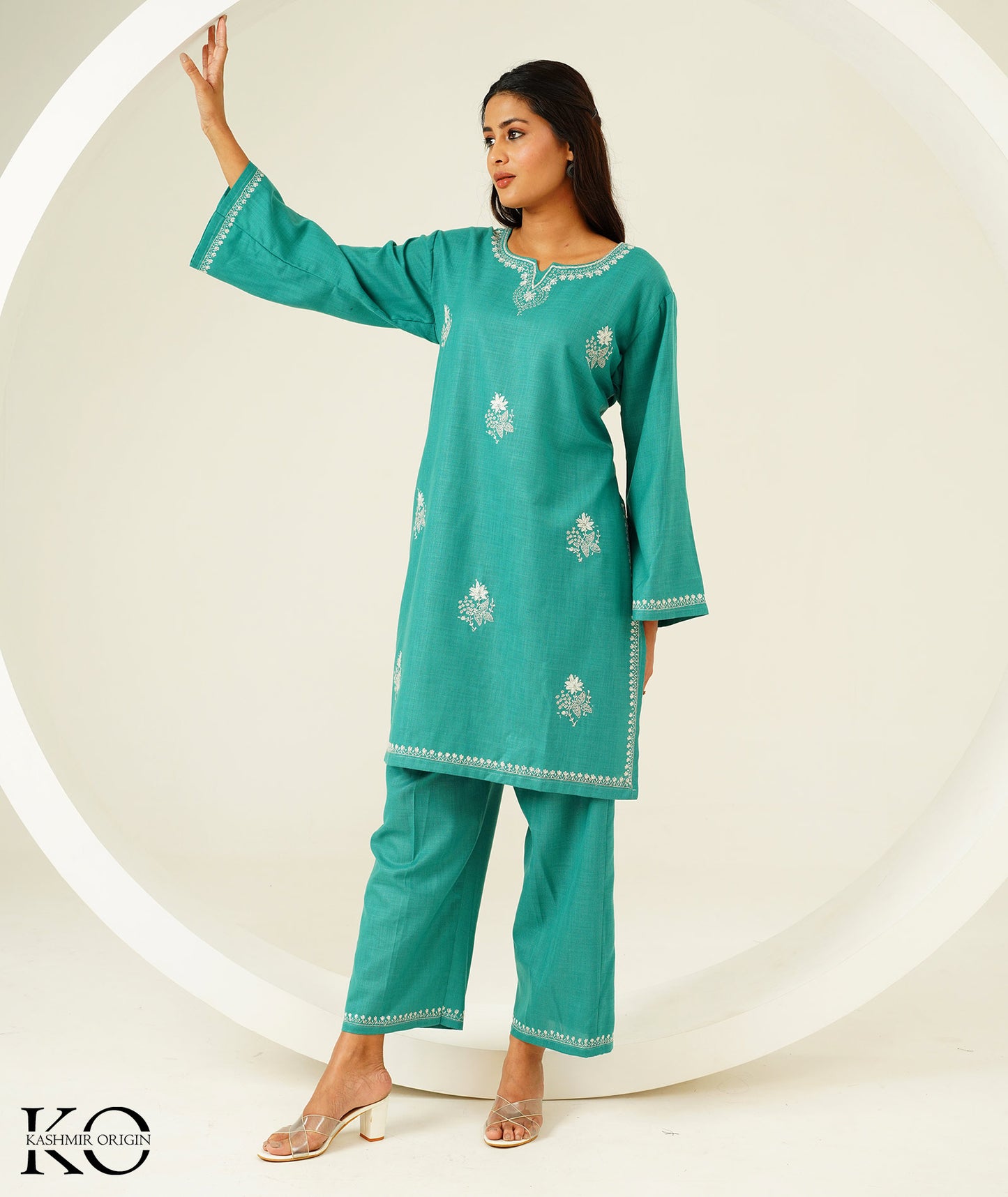- Fit - Our comfort fitted Hand Sozni Embroidered Kashmiri Coordset is made from soft, breathable fabric and adorned with flawless stitching and traditional Kashmiri embroidery.