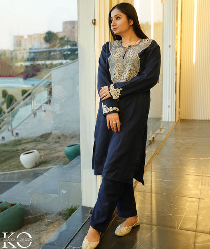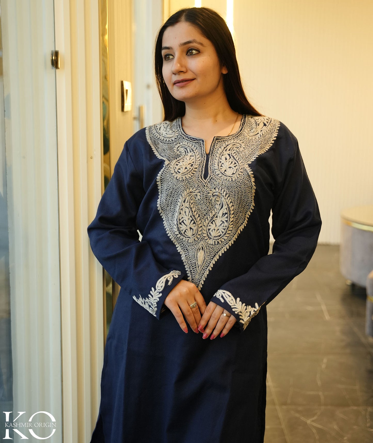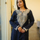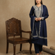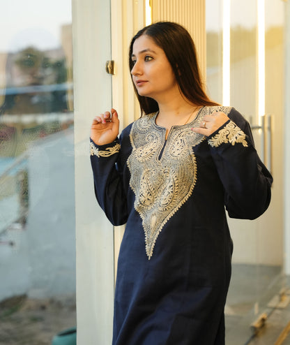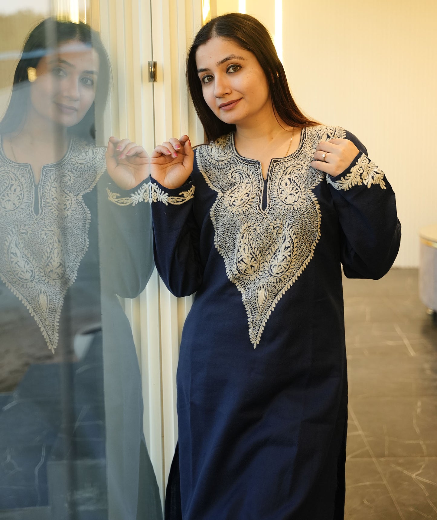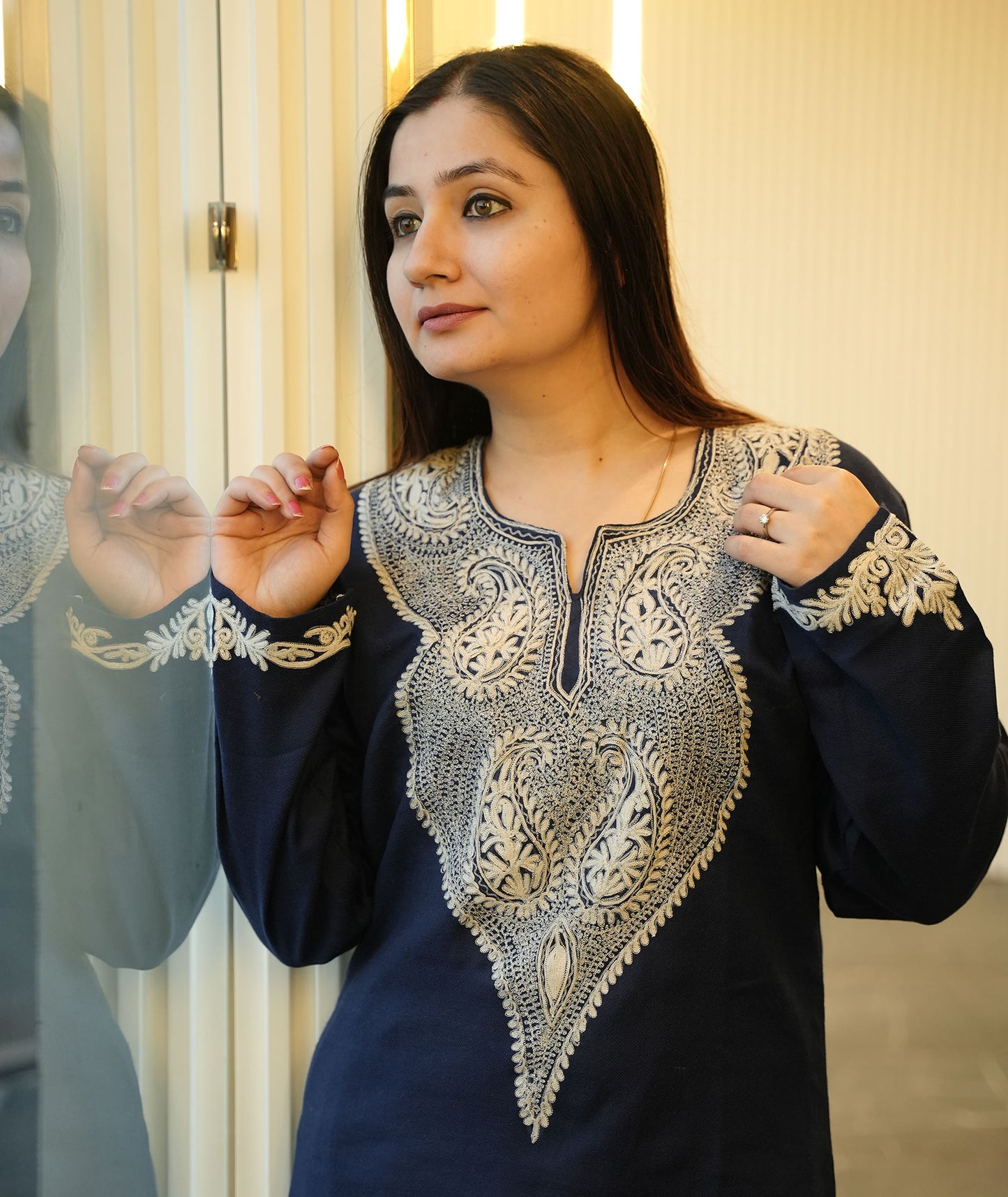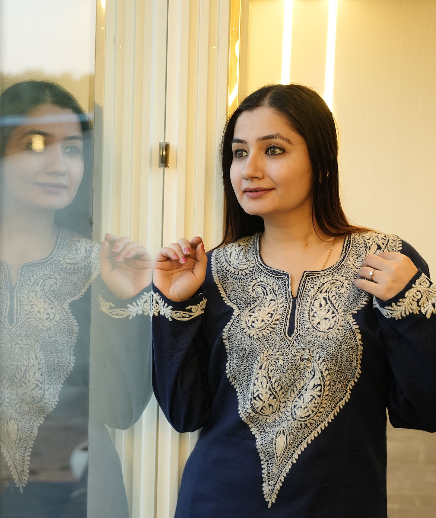 Navy Blue with White Zari and Aari Embroidered Woolen Suit With Shawl